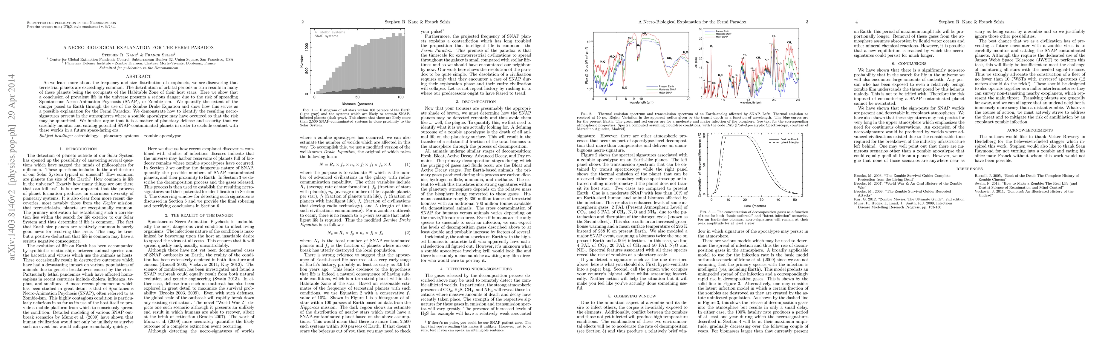 As we learn more about the frequency and size distribution of exoplanets, we are discovering that terrestrial planets are exceedingly common. The distribution of orbital periods in turn results in many of these planets being the occupants of the Habitable Zone of their host stars. Here we show that a conclusion of prevalent life in the universe presents a serious danger due to the risk of spreading Spontaneous Necro-Animation Psychosis (SNAP), or Zombie-ism. We quantify the extent of the danger posed to Earth through the use of the Zombie Drake Equation and show how this serves as a possible explanation for the Fermi Paradox. We demonstrate how to identify the resulting necro-signatures present in the atmospheres where a zombie apocalypse may have occurred so that the risk may be quantified. We further argue that it is a matter of planetary defense and security that we carefully monitor and catalog potential SNAP-contaminated planets in order to exclude contact with these worlds in a future space-faring era.