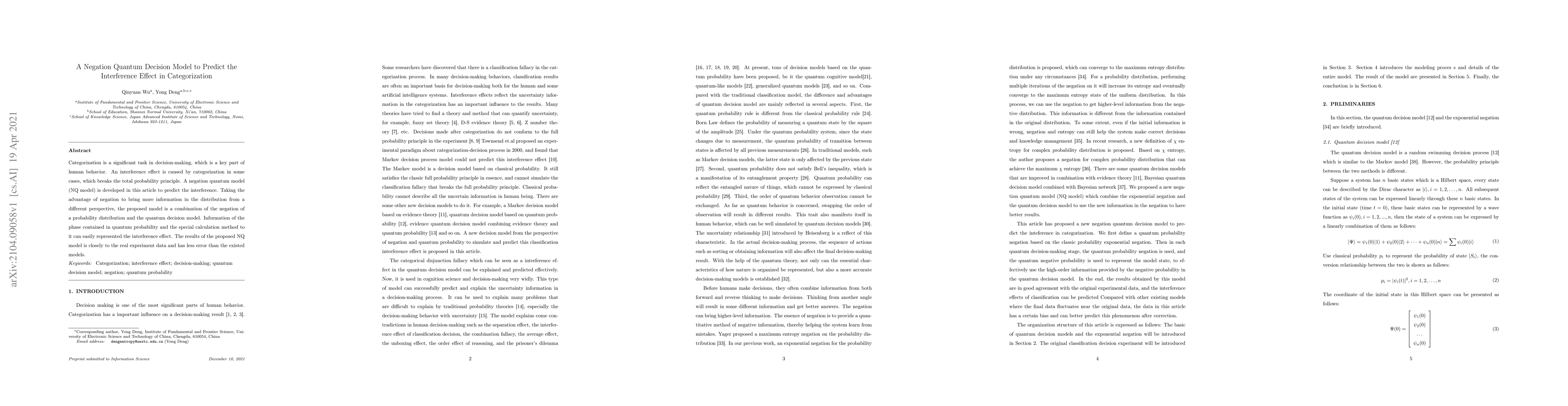 This paper introduces a Negation Quantum Decision Model (NQ model) to predict interference effects in categorization, combining negation of probability distributions and quantum decision theory to better represent interference. The NQ model shows improved accuracy over existing models by leveraging quantum probability and phase information.