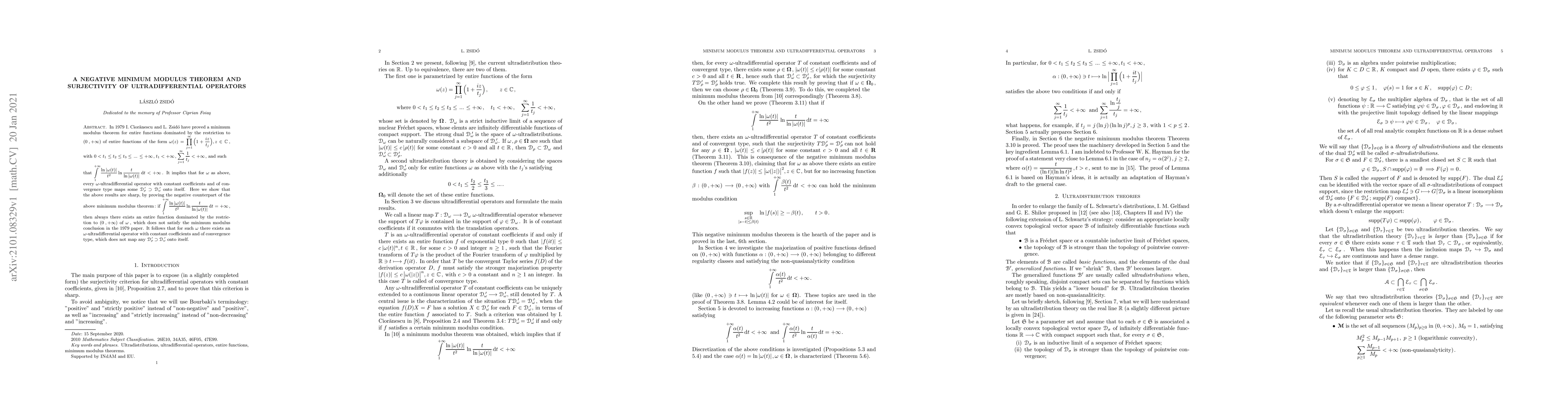 Researchers prove that a 1979 minimum modulus theorem for entire functions is optimal, demonstrating that certain conditions can lead to non-satisfying results, with implications for ultra differential operators.