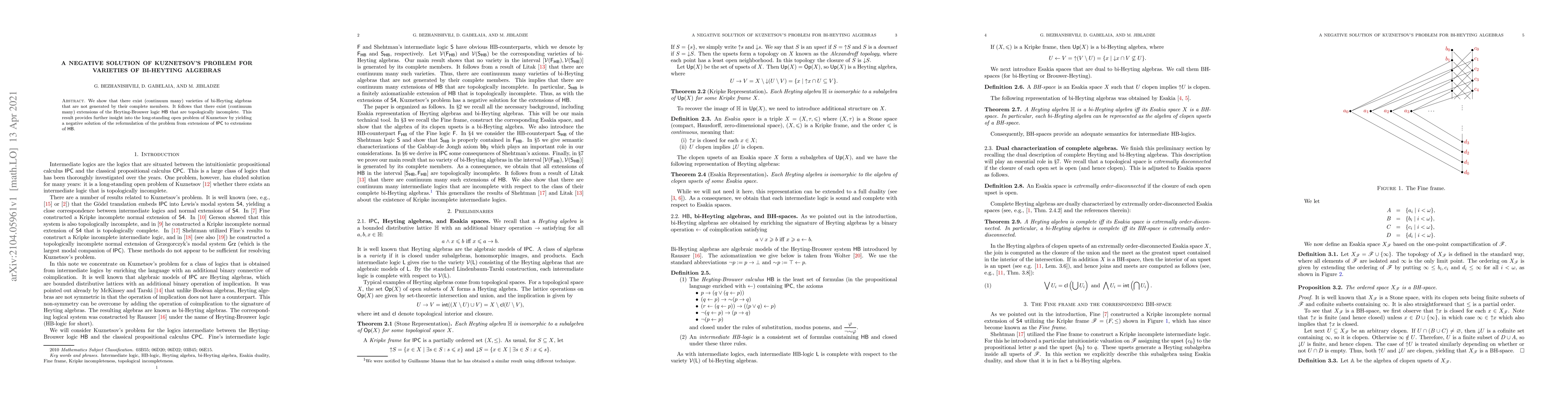 The work presents a negative solution to Kuznetsov's problem via a distinct approach, highlighting the incompleteness of certain extensions of $\mathsf{HB}$ and providing new insights into the structure of bi-Heyting algebras.