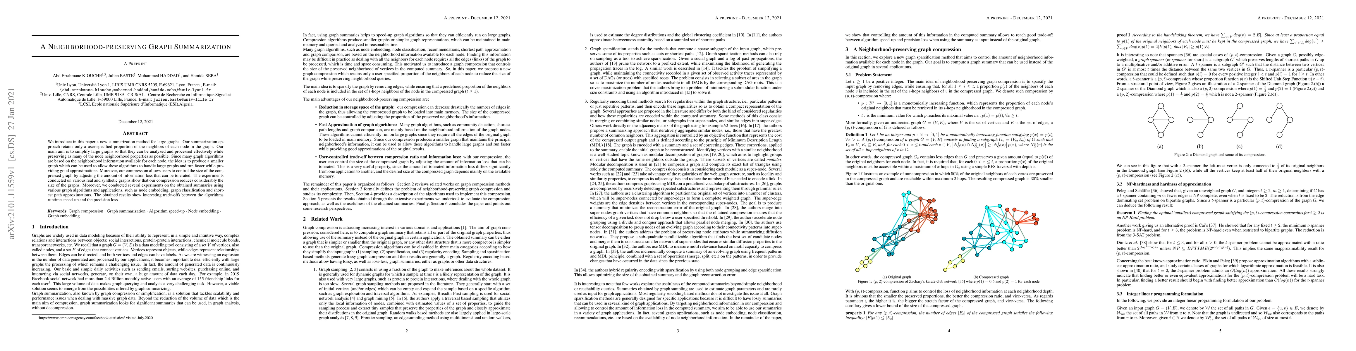 This paper proposes a novel graph summarization method that retains a user-specified proportion of each node's neighbors to simplify large graphs for effective analysis. The method balances size reduction and neighborhood property preservation, enabling faster algorithm execution with acceptable precision loss.