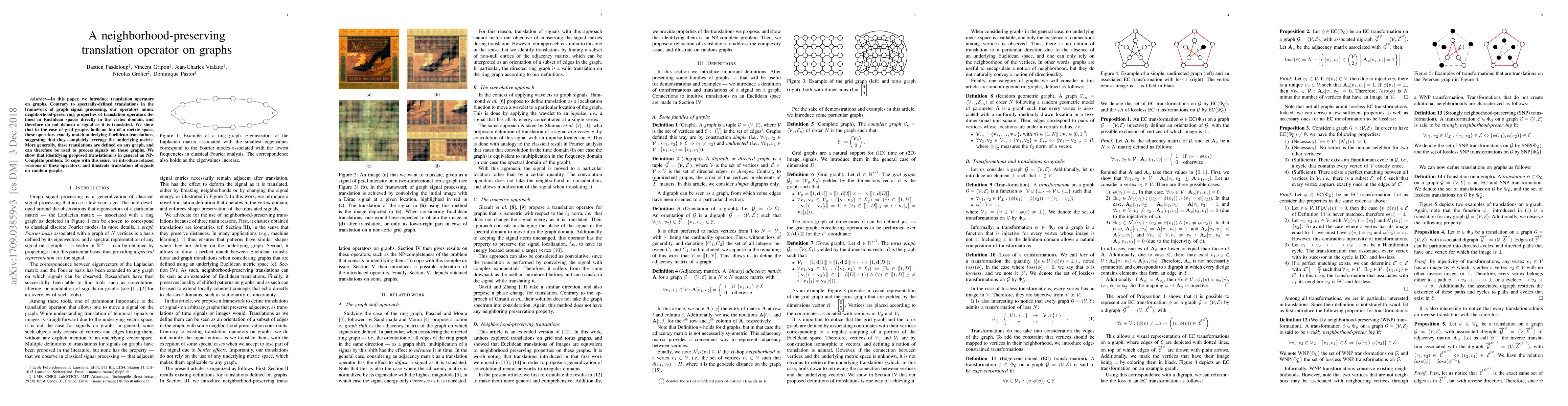 This paper introduces neighborhood-preserving translation operators on graphs that mimic Euclidean translation properties directly in the vertex domain, preserving signal integrity during translation. It demonstrates their exact match with Euclidean translations on grid graphs and discusses their application to signal processing on various graphs, though identifying these translations is NP-Complete, prompting the introduction of relaxed versions for practical use.