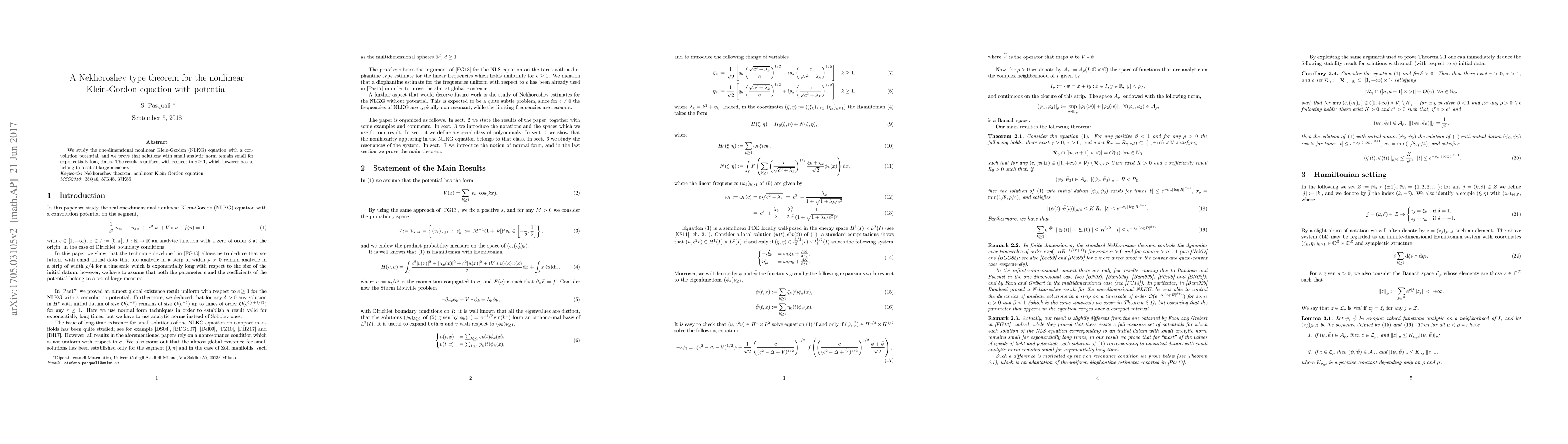 We study the one-dimensional nonlinear Klein-Gordon (NLKG) equation with a convolution potential, and we prove that solutions with small analytic norm remain small for exponentially long times. The result is uniform with respect to $c \geq 1$, which however has to belong to a set of large measure.