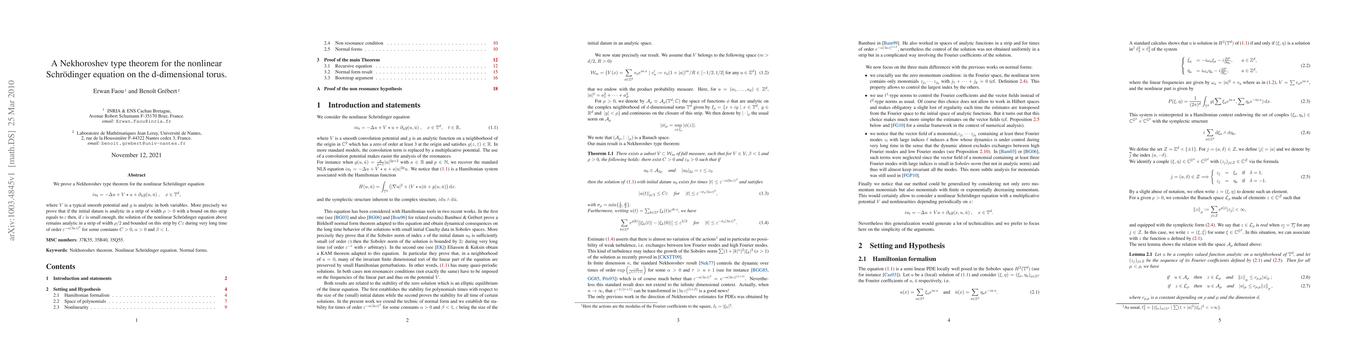This paper proves a Nekhoroshev type theorem for the nonlinear Schr"odinger equation, showing that solutions remain analytic in a smaller strip of width $ ho/2$ with boundedness for an extended time period.