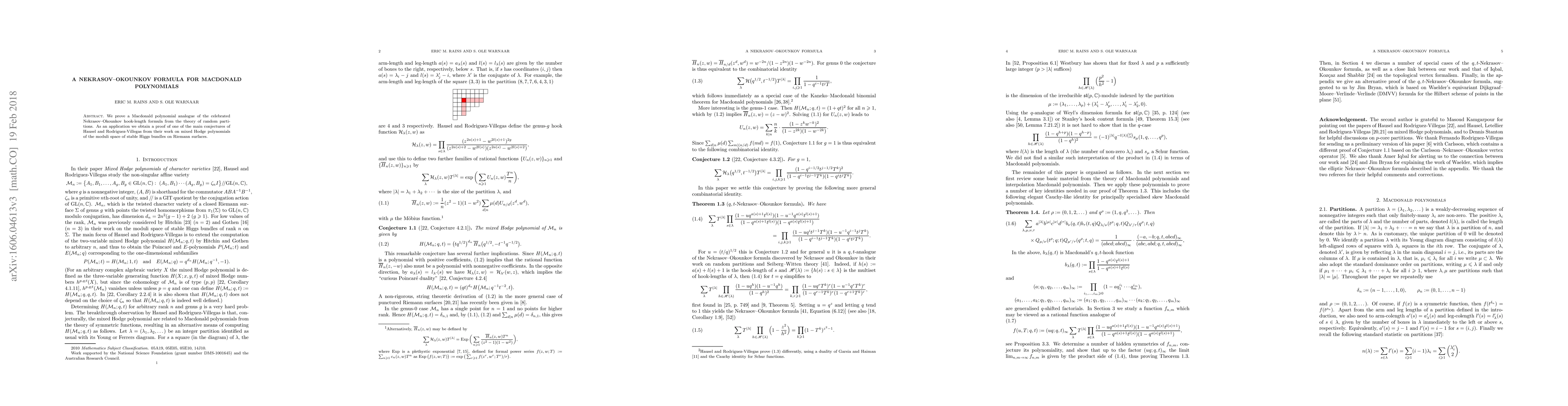 We prove a Macdonald polynomial analogue of the celebrated Nekrasov-Okounkov hook-length formula from the theory of random partitions. As an application we obtain a proof of one of the main conjectures of Hausel and Rodriguez-Villegas from their work on mixed Hodge polynomials of the moduli space of stable Higgs bundles on Riemann surfaces.