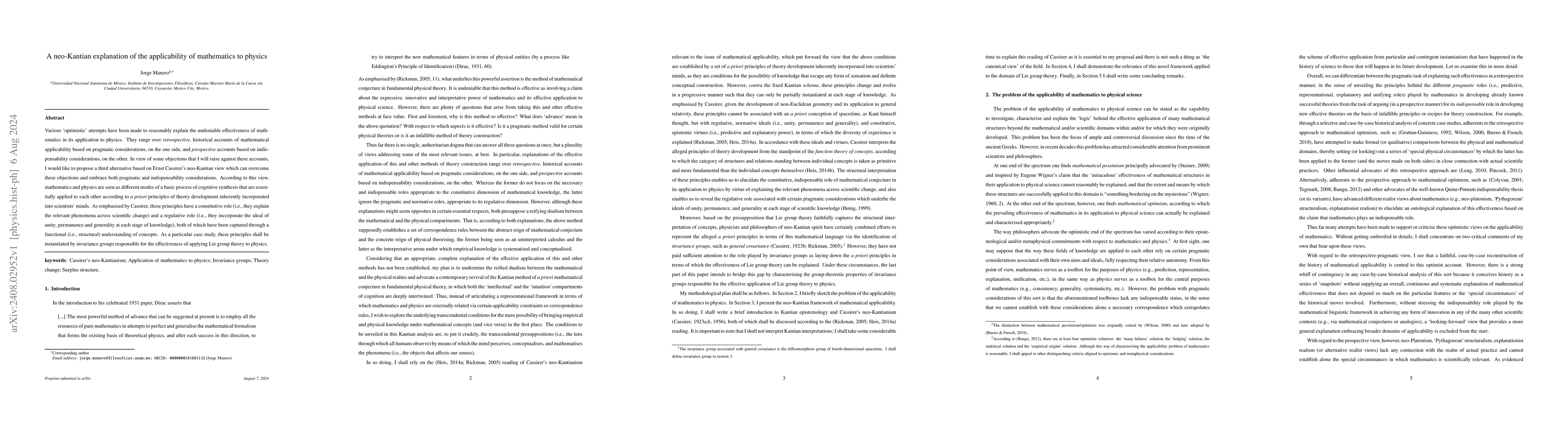 Various 'optimistic' attempts have been made to reasonably explain the undeniable effectiveness of mathematics in its application to physics. They range over retrospective, historical accounts of mathematical applicability based on pragmatic considerations, on the one side, and prospective accounts based on indispensability considerations, on the other. In view of some objections that I will raise against these accounts, I would like to propose a third alternative based on Ernst Cassirer's neo-Kantian view which can overcome these objections and embrace both pragmatic and indispensability considerations. According to this view, mathematics and physics are seen as different modes of a basic process of cognitive synthesis that are essentially applied to each other according to a priori principles of theory development inherently incorporated into scientists' minds. As emphasised by Cassirer, these principles have a constitutive role (i.e., they explain the relevant phenomena across scientific change) and a regulative role (i.e., they incorporate the ideal of unity, permanence and generality at each stage of knowledge), both of which have been captured through a functional (i.e., structural) understanding of concepts. As a particular case study, these principles shall be instantiated by invariance groups responsible for the effectiveness of applying Lie group theory to physics.
