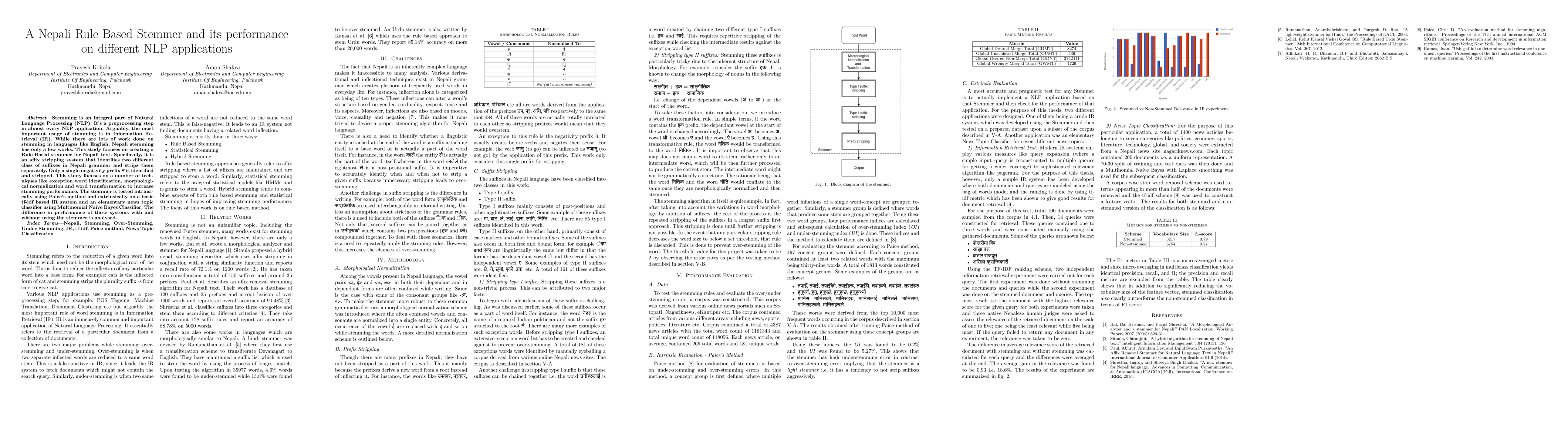 A Rule Based stemmer for Nepali text was developed to improve Natural Language Processing applications, with promising results in Information Retrieval and topic classification tasks.
