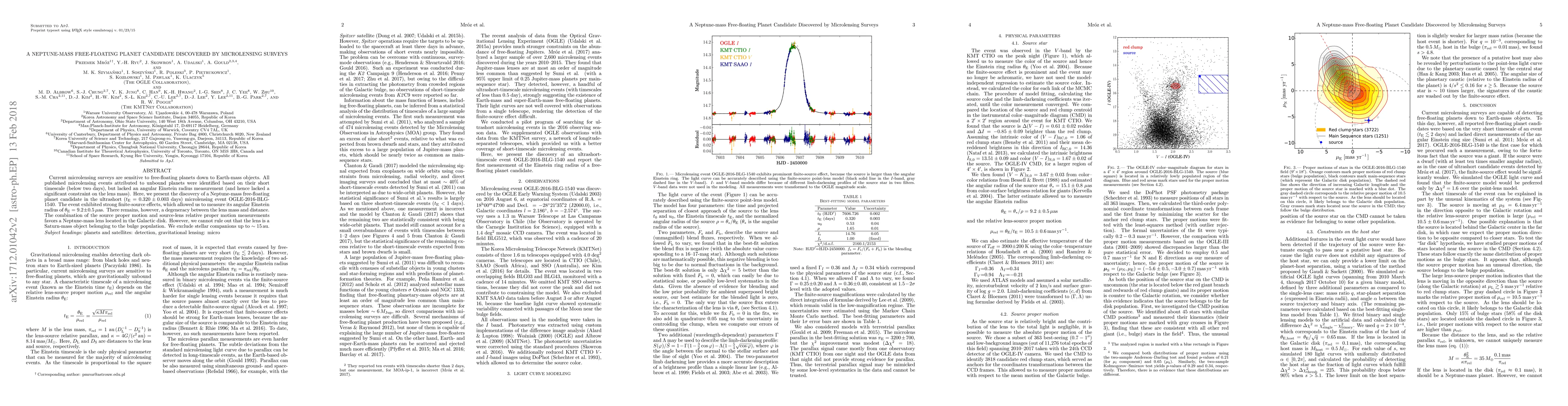 This paper reports the discovery of a Neptune-mass free-floating planet candidate detected via a microlensing event with a short timescale of 0.32 days. The event's strong finite-source effects enabled the measurement of its angular Einstein radius, suggesting a Neptune-mass lens in the Galactic disk, though a Saturn-mass object in the bulge cannot be ruled out.