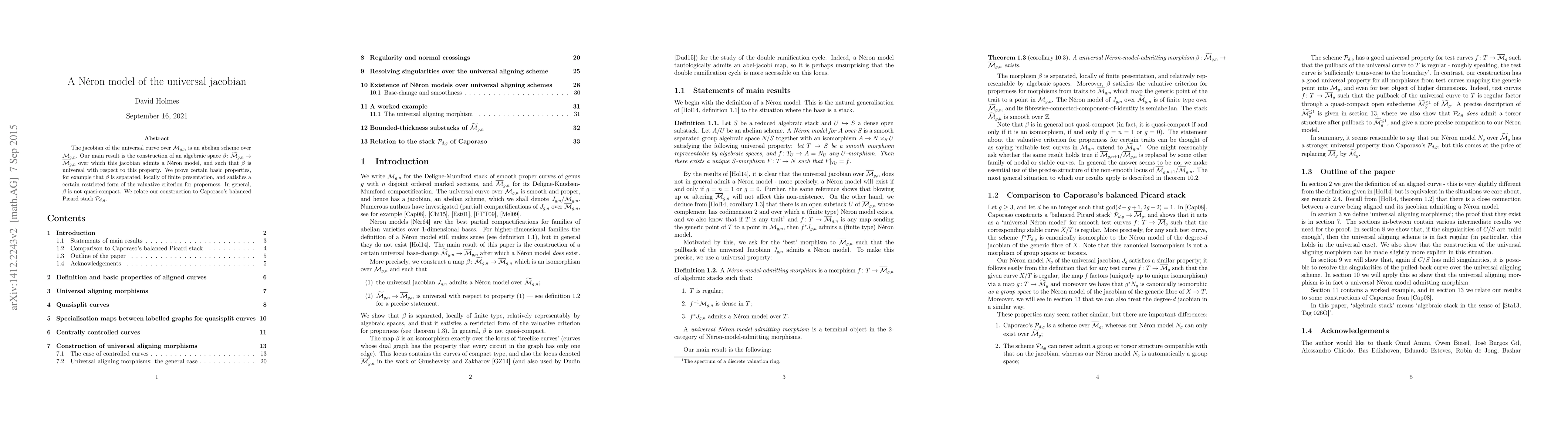 This paper constructs a Néron model for the universal Jacobian of the universal curve over $\mathcal{M}_{g,n}$, establishing an algebraic space $\beta$ that satisfies the universal property and basic properties like being separated and locally of finite presentation. The construction is linked to Caporaso's balanced Picard stack $\mathcal{P}_{d,g}$.