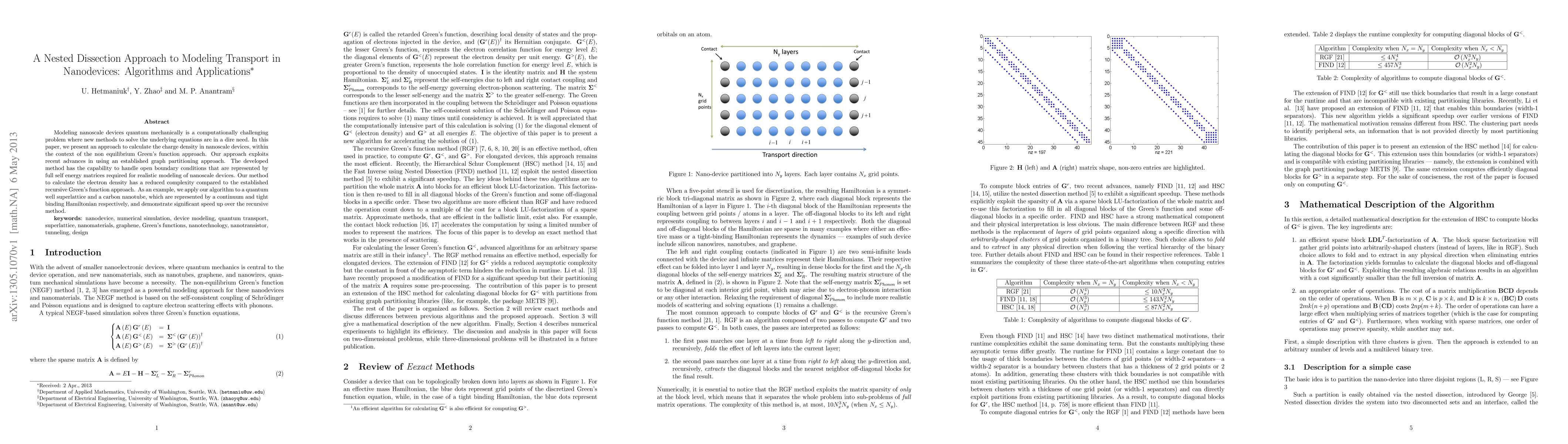 Modeling nanoscale devices quantum mechanically is a computationally challenging problem where new methods to solve the underlying equations are in a dire need. In this paper, we present an approach to calculate the charge density in nanoscale devices, within the context of the non equilibrium Greens function approach. Our approach exploits recent advances in using an established graph partitioning approach. The developed method has the capability to handle open boundary conditions that are represented by full self energy matrices required for realistic modeling of nanoscale devices. Our method to calculate the electron density has a reduced complexity compared to the established recursive Greens function approach. As an example, we apply our algorithm to a quantum well superlattice and a carbon nanotube, which are represented by a continuum and tight binding Hamiltonian respectively, and demonstrate significant speed up over the recursive method.