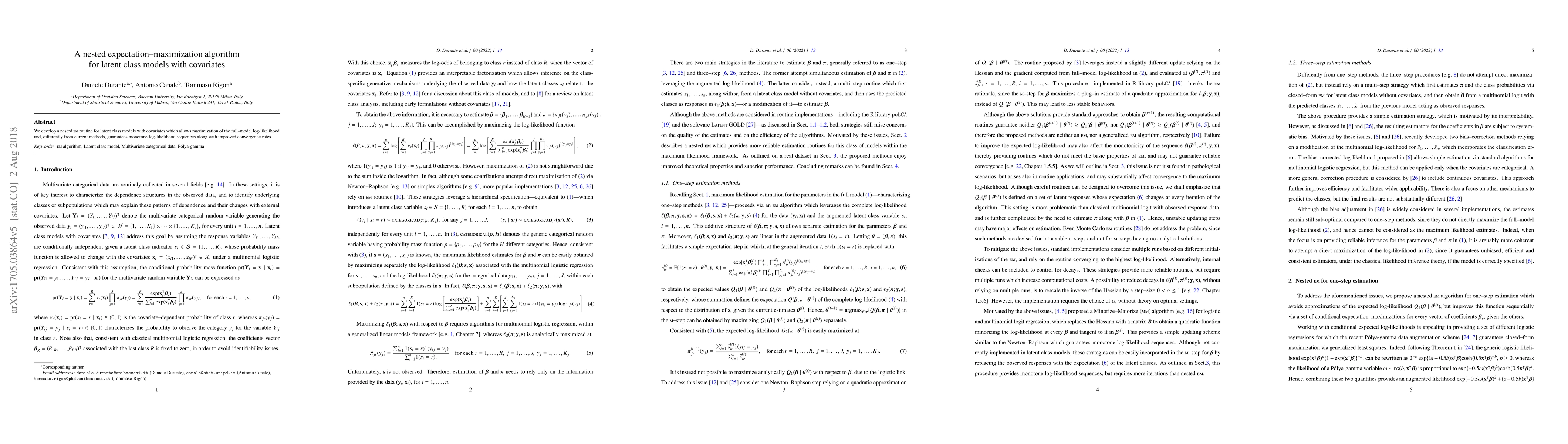 Summary: This paper introduces a nested EM algorithm for latent class models incorporating covariates, ensuring monotonic log-likelihood increases and faster convergence compared to existing methods. The approach maximizes the full-model log-likelihood effectively.