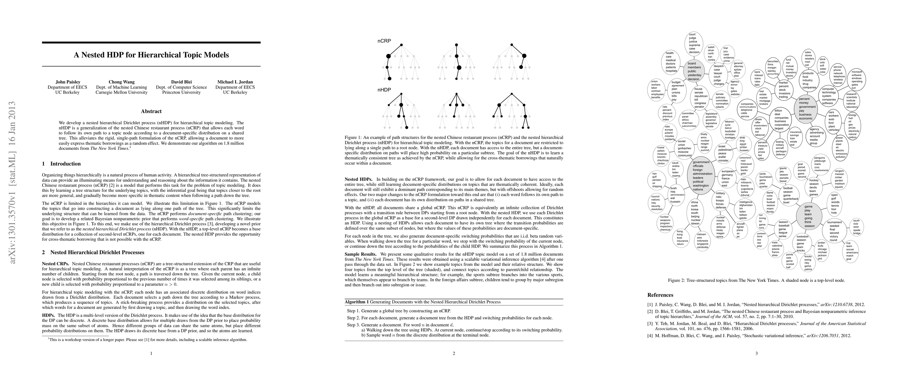 The paper proposes a nested hierarchical Dirichlet process (nHDP) for hierarchical topic modeling, which generalizes the nested Chinese restaurant process to allow flexible, document-specific word-to-topic paths, enhancing thematic borrowing. The method is demonstrated on a dataset of 1.8 million documents from The New York Times.