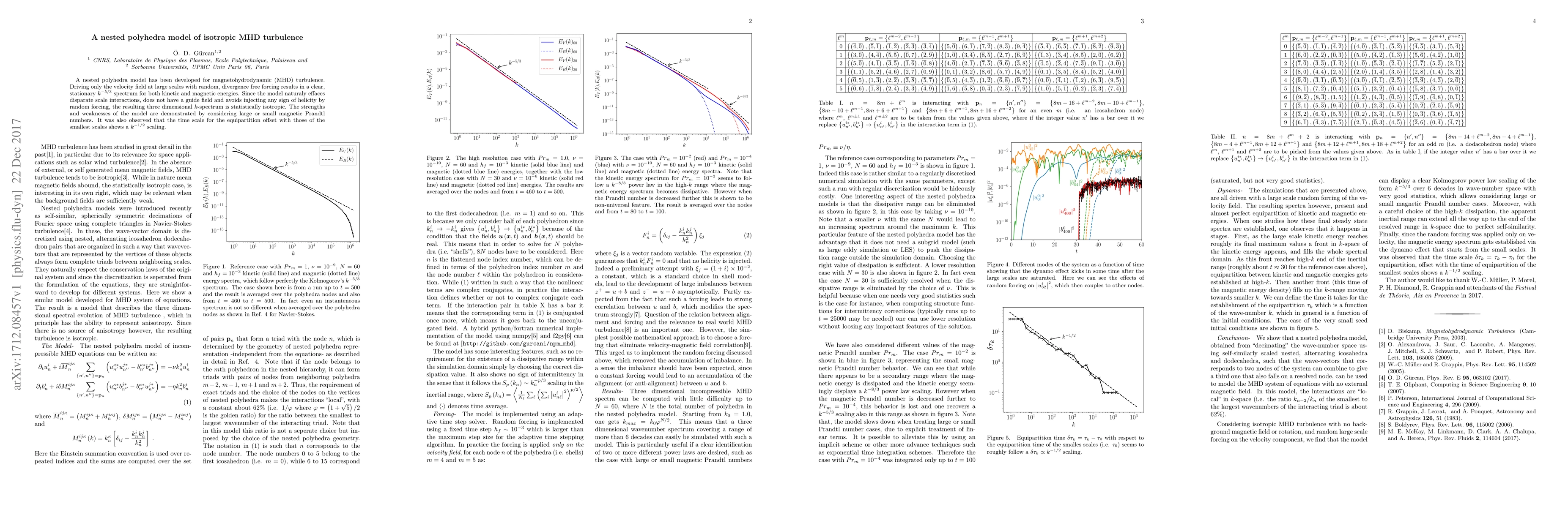 A nested polyhedra model has been developed for magnetohydrodynamic (MHD) turbulence. Driving only the velocity field at large scales with random, divergence free forcing results in a clear, stationary $k^{-5/3}$ spectrum for both kinetic and magnetic energies. Since the model naturaly effaces disparate scale interactions, does not have a guide field and avoids injecting any sign of helicity by random forcing, the resulting three dimensional k-spectrum is statistically isotropic. The strengths and weaknesses of the model are demonstrated by considering large or small magnetic Prandtl numbers. It was also observed that the time scale for the equipartition offset with those of the smallest scales shows a $k^{-1/2}$ scaling.