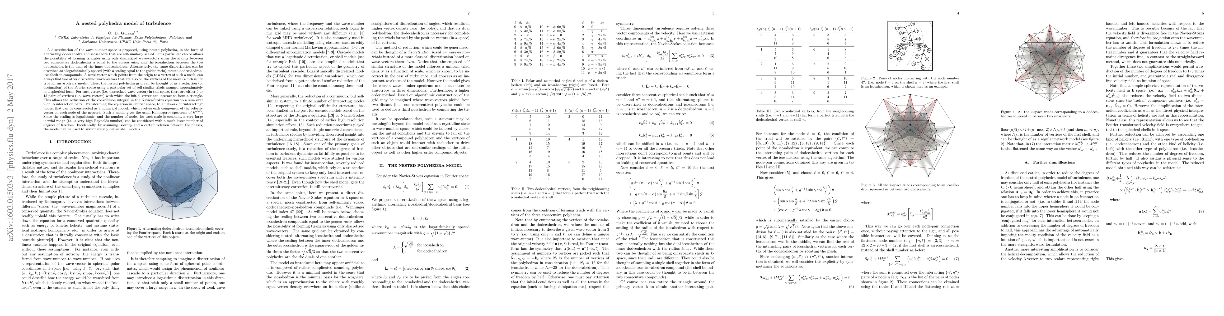 A discretization of the wave-number space is proposed, using nested polyhedra, in the form of alternating dodecahedra and icosahedra that are self-similarly scaled. This particular choice allows the possibility of forming triangles using only discretized wave-vectors when the scaling between two consecutive dodecahedra is equal to the golden ratio, and the icosahedron between the two dodecahedra is the dual of the inner dodecahedron. Alternatively, the same discretization can be described as a logarithmically spaced (with a scaling equal to the golden ratio), nested dodecahedron-icosahedron compounds. A wave-vector which points from the origin to a vertex of such a mesh, can always find two other discretized wave-vectors that are also on the vertices of the mesh (which is not true for an arbitrary mesh). Thus, the nested polyhedra grid can be thought of as a reduction (or decimation) of the Fourier space using a particular set of self-similar triads aranged approximately in a spherical form. For each vertex (i.e. discretized wave-vector) in this space, there are either 9 or 15 pairs of vertices (i.e. wave-vectors) with which the initial vertex can interact to form a triangle. This allows the reduction of the convolution integral in the Navier-Stokes equation to a sum over 9 or 15 interaction pairs. Transforming the equation in Fourier space, to a network of interacting nodes, that can be constructed as a numerical model, which evolves each component of the velocity vector on each node of the network. Such a model gives the usual Kolmogorov spectrum. Since the scaling is logarithmic, and the number of nodes for each scale is constant, a very large inertial range can be considered with a much lower number of degrees of freedom. Incidentally, by assuming isotropy and a certain relation between the phases, the model can be used to systematically derive three dimensional shell models.