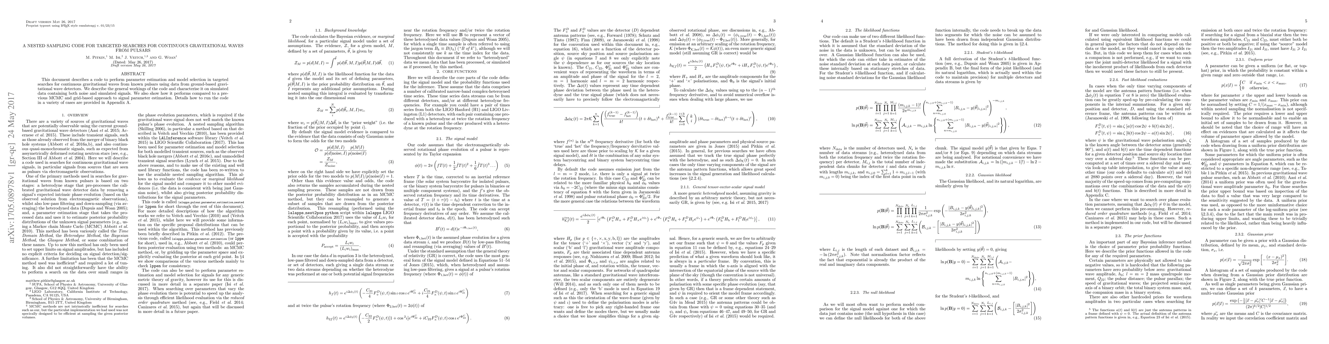 This paper introduces a nested sampling code for targeted searches of continuous gravitational waves from known pulsars, demonstrating its performance on simulated data and comparing it favorably to previous MCMC and grid-based methods. Detailed usage instructions are provided in Appendix A.