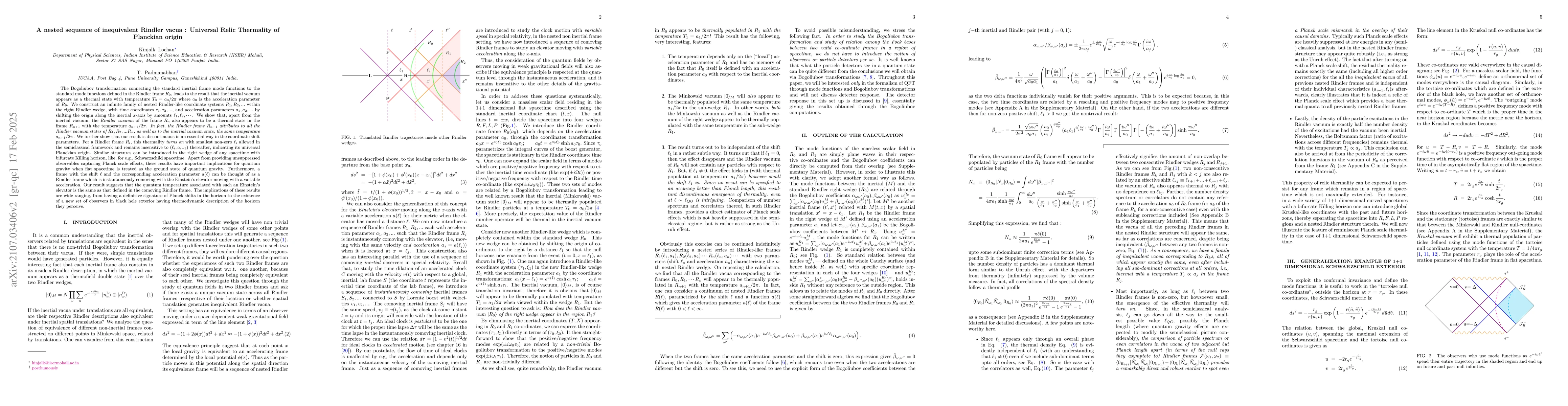 The Bogoliubov transformation connecting the standard inertial frame mode functions to the standard mode functions defined in the Rindler frame $R_0$, leads to the result that the inertial vacuum appears as a thermal state with temperature $T_0=a_0/2\pi$ where $a_0$ is the acceleration parameter of $R_0$. We construct an infinite family of nested Rindler-like coordinate systems $R_1, R_2, ...$ within the right Rindler wedge, with time coordinates $\tau_1, \tau_2, ...,$ and acceleration parameters $a_1, a_2, ...$ by shifting the origin along the inertial $x$-axis by amounts $\ell_1, \ell_2,\cdots$. We show that, apart from the inertial vacuum, the Rindler vacuum of the frame $R_n$ also appears to be a thermal state in the frame $R_{n+1}$ with the temperature $a_{n+1}/2\pi$. In fact, the Rindler frame $R_{n+1}$ attributes to all the Rindler vacuum states of $R_1, R_2, ... R_n$, as well as to the inertial vacuum state, the same temperature $a_{n+1}/2\pi$. The frame with the shift $\ell$ and the corresponding acceleration parameter $a(\ell)$ can be thought of as a Rindler frame which is instantaneously comoving with the Einstein's elevator moving with a variable acceleration. Our result suggests that the quantum temperature associated with such an Einstein's elevator is the same as that defined in the comoving Rindler frame. The shift parameters $\ell_j$ are crucial for the inequivalent character of these vacua and encode the fact that Rindler vacua are not invariant under spatial translation. We further show that our result is discontinuous in an essential way in the coordinate shift parameters. Similar structures can be introduced in the right wedge of any spacetime with bifurcate Killing horizon, like, for e.g., Schwarzschild spacetime. This has important implications for quantum gravity when flat spacetime is treated as the ground state of quantum gravity.