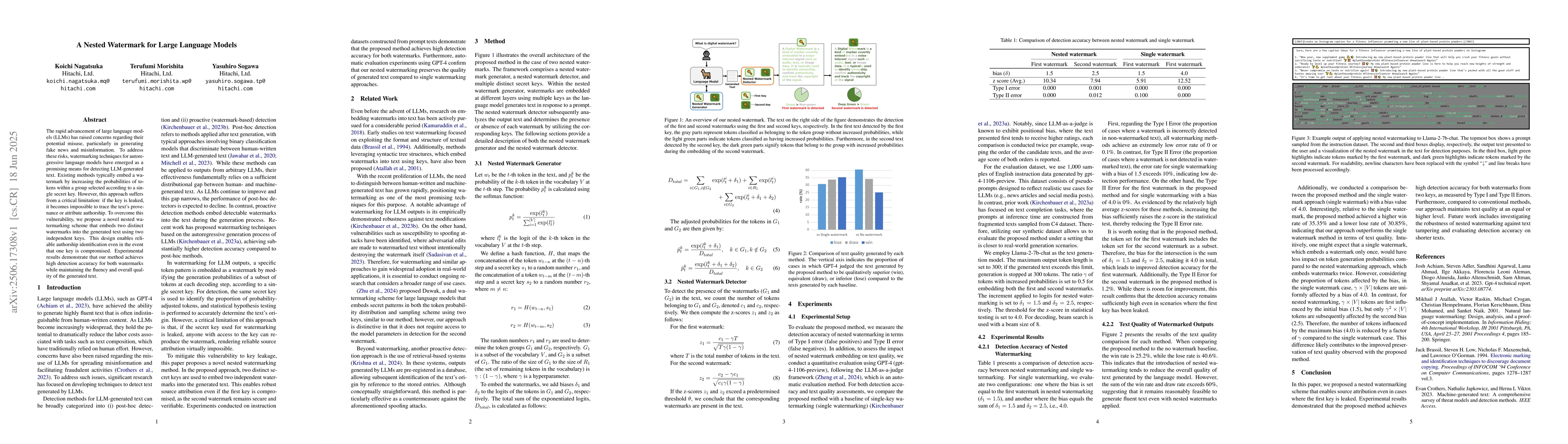 The research proposes a nested watermarking scheme for large language models (LLMs) using two independent keys to embed watermarks, ensuring reliable authorship identification even if one key is compromised.