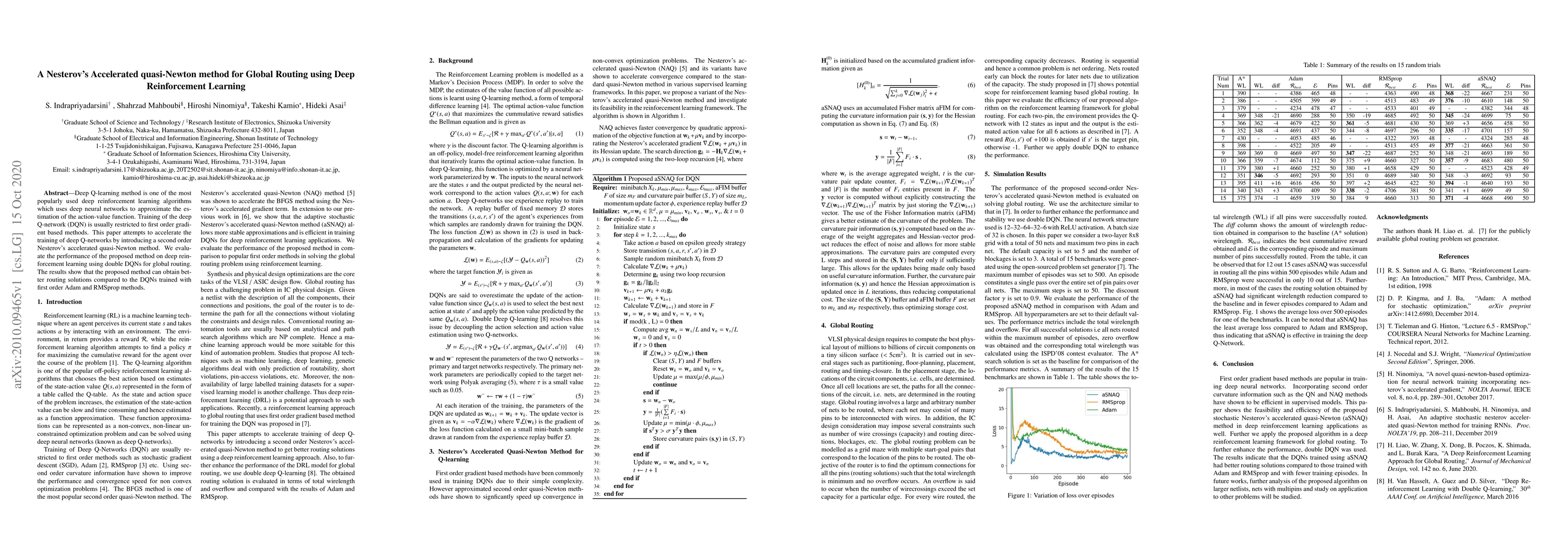 This paper proposes a Nesterov's accelerated quasi-Newton method to accelerate the training of deep Q-networks in deep reinforcement learning. The method improves performance over first-order gradient methods like Adam and RMSprop, particularly in global routing applications using double DQNs.