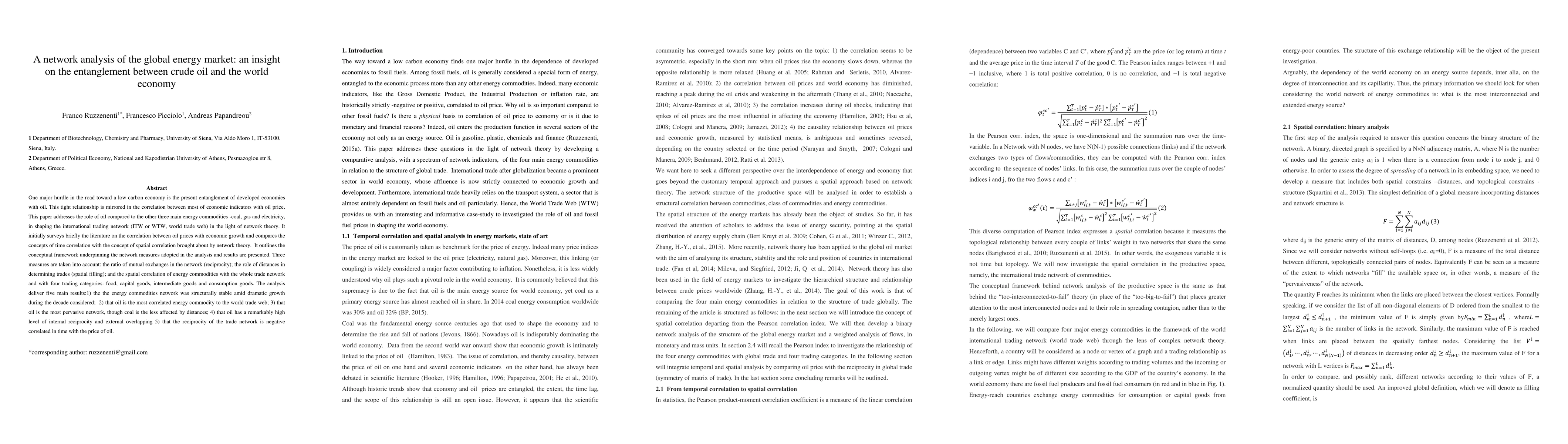 One major hurdle in the road toward a low carbon economy is the present entanglement of developed economies with oil. This tight relationship is mirrored in the correlation between most of economic indicators with oil price. This paper addresses the role of oil compared to the other three main energy commodities -coal, gas and electricity, in shaping the international trading network (ITW or WTW, world trade web) in the light of network theory. It initially surveys briefly the literature on the correlation between oil prices with economic growth and compares the concepts of time correlation with the concept of spatial correlation brought about by network theory. It outlines the conceptual framework underpinning the network measures adopted in the analysis and results are presented. Three measures are taken into account: the ratio of mutual exchanges in the network (reciprocity); the role of distances in determining trades (spatial filling); and the spatial correlation of energy commodities with the whole trade network and with four trading categories: food, capital goods, intermediate goods and consumption goods. The analysis deliver five main results:1) the the energy commodities network was structurally stable amid dramatic growth during the decade considered; 2) that oil is the most correlated energy commodity to the world trade web; 3) that oil is the most pervasive network, though coal is the less affected by distances; 4) that oil has a remarkably high level of internal reciprocity and external overlapping 5) that the reciprocity of the trade network is negative correlated in time with the price of oil.
