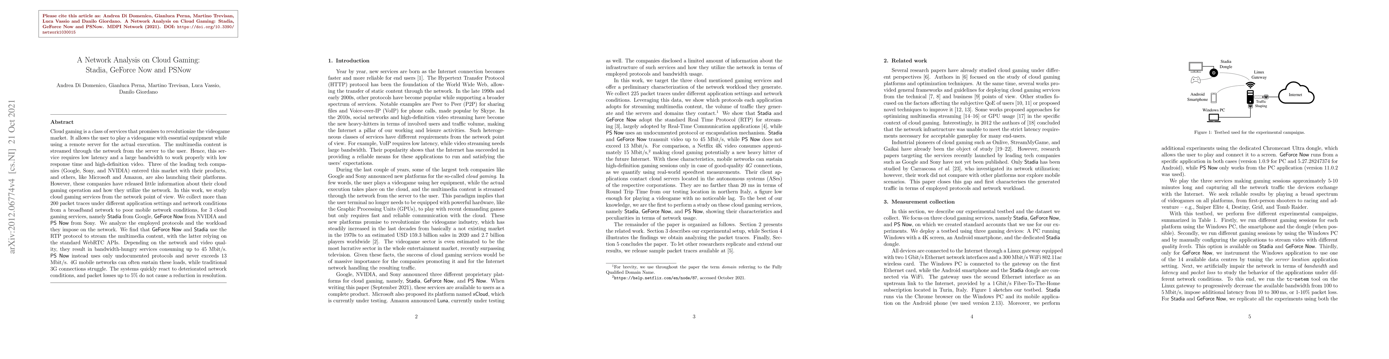 This research analyzes the network protocols and performance of three leading cloud gaming services: Stadia, GeForce Now, and PS Now. The study finds that GeForce Now and Stadia use RTP with WebRTC for high-bandwidth streaming, while PS Now employs undocumented protocols with lower bandwidth consumption.