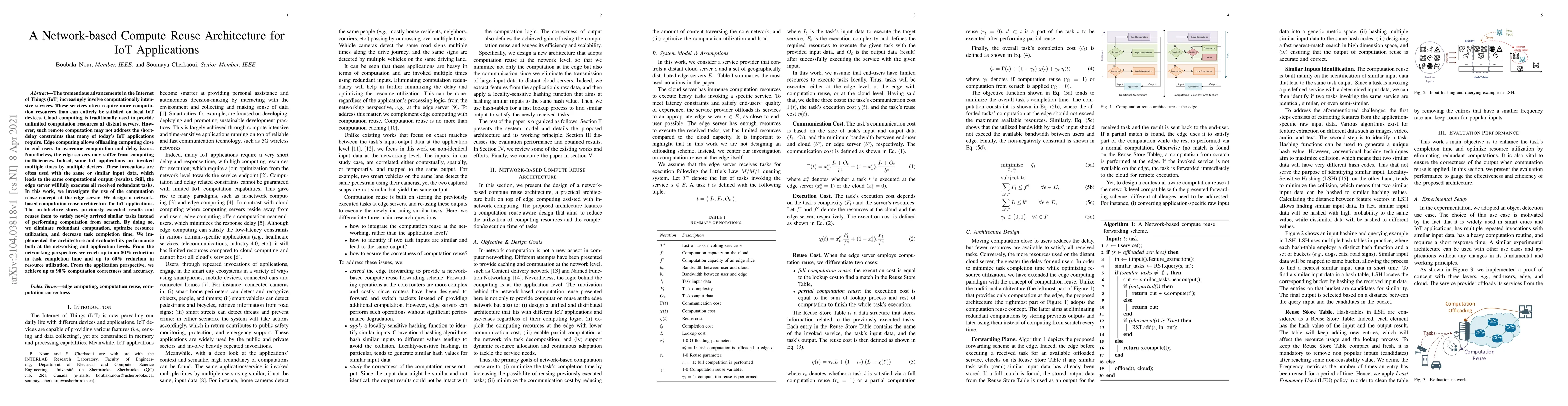 This paper proposes a network-based compute reuse architecture to optimize edge computing for IoT applications by storing and reusing previously computed results to eliminate redundant tasks, achieving up to 80% reduction in task completion time and 60% reduction in resource utilization.