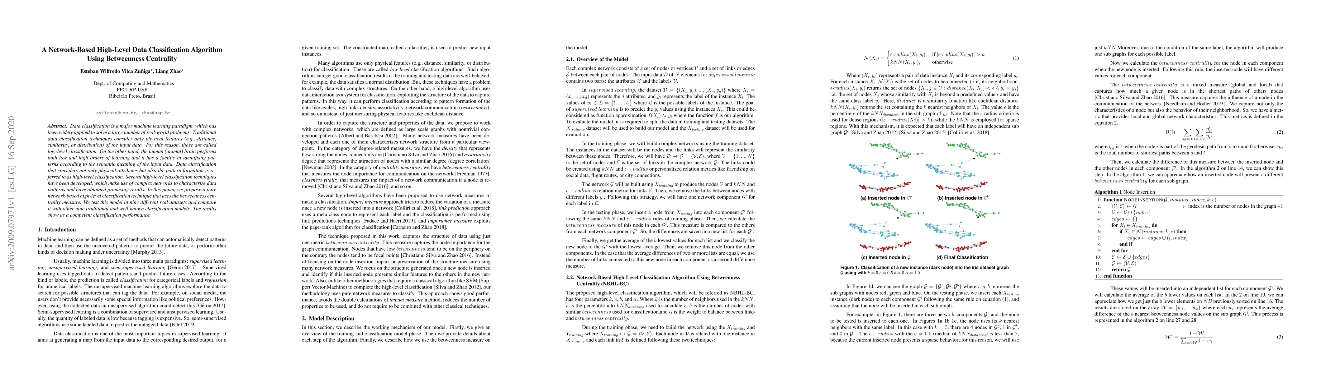 This paper proposes a network-based high-level data classification algorithm using betweenness centrality to characterize data patterns, achieving competitive classification performance compared to traditional methods across nine real datasets.
