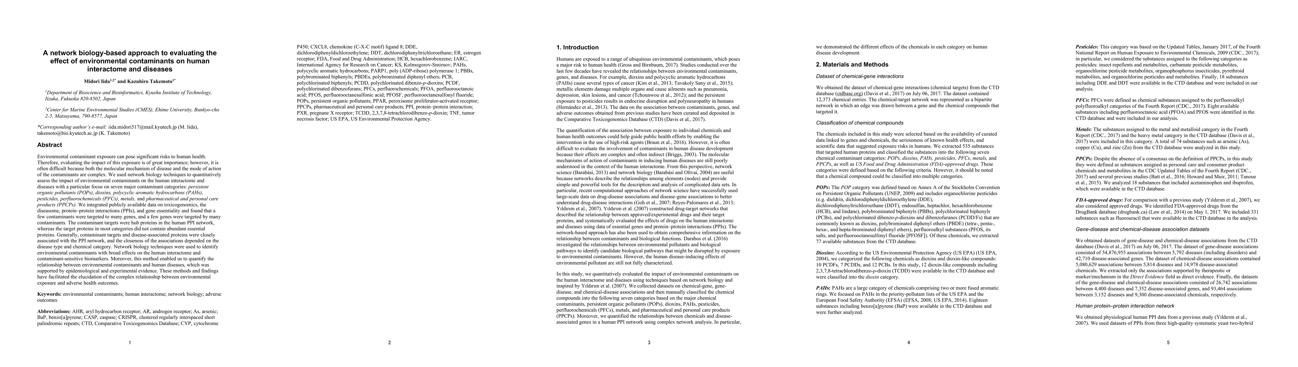 Environmental contaminant exposure can pose significant risks to human health. Therefore, evaluating the impact of this exposure is of great importance; however, it is often difficult because both the molecular mechanism of disease and the mode of action of the contaminants are complex. We used network biology techniques to quantitatively assess the impact of environmental contaminants on the human interactome and diseases with a particular focus on seven major contaminant categories: persistent organic pollutants (POPs), dioxins, polycyclic aromatic hydrocarbons (PAHs), pesticides, perfluorochemicals (PFCs), metals, and pharmaceutical and personal care products (PPCPs). We integrated publicly available data on toxicogenomics, the diseasome, protein-protein interactions (PPIs), and gene essentiality and found that a few contaminants were targeted to many genes, and a few genes were targeted by many contaminants. The contaminant targets were hub proteins in the human PPI network, whereas the target proteins in most categories did not contain abundant essential proteins. Generally, contaminant targets and disease-associated proteins were closely associated with the PPI network, and the closeness of the associations depended on the disease type and chemical category. Network biology techniques were used to identify environmental contaminants with broad effects on the human interactome and contaminant-sensitive biomarkers. Moreover, this method enabled us to quantify the relationship between environmental contaminants and human diseases, which was supported by epidemiological and experimental evidence. These methods and findings have facilitated the elucidation of the complex relationship between environmental exposure and adverse health outcomes.