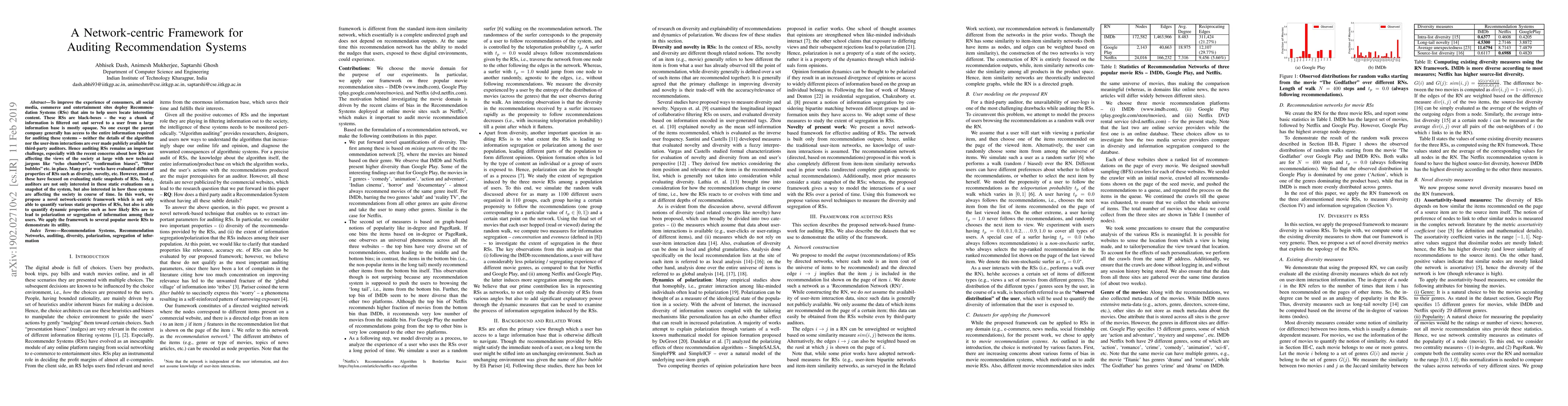 To improve the experience of consumers, all social media, commerce and entertainment sites deploy Recommendation Systems (RSs) that aim to help users locate interesting content. These RSs are black-boxes - the way a chunk of information is filtered out and served to a user from a large information base is mostly opaque. No one except the parent company generally has access to the entire information required for auditing these systems - neither the details of the algorithm nor the user-item interactions are ever made publicly available for third-party auditors. Hence auditing RSs remains an important challenge, especially with the recent concerns about how RSs are affecting the views of the society at large with new technical jargons like "echo chambers", "confirmation biases", "filter bubbles" etc. in place. Many prior works have evaluated different properties of RSs such as diversity, novelty, etc. However, most of these have focused on evaluating static snapshots of RSs. Today, auditors are not only interested in these static evaluations on a snapshot of the system, but also interested in how these systems are affecting the society in course of time. In this work, we propose a novel network-centric framework which is not only able to quantify various static properties of RSs, but also is able to quantify dynamic properties such as how likely RSs are to lead to polarization or segregation of information among their users. We apply the framework to several popular movie RSs to demonstrate its utility.