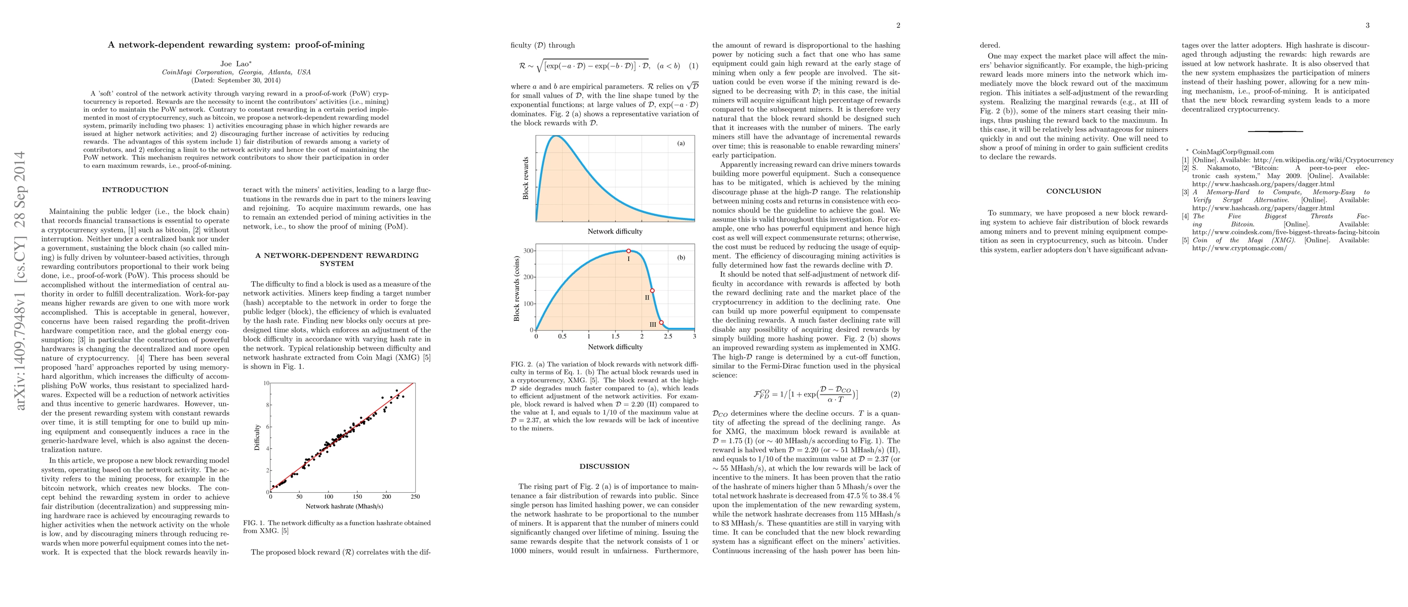 This paper proposes a network-dependent rewarding system for proof-of-work cryptocurrencies, featuring two phases: incentivizing higher rewards during increased network activity and discouraging excessive activity by reducing rewards. This model aims to ensure fair reward distribution and limit the cost of maintaining the network.