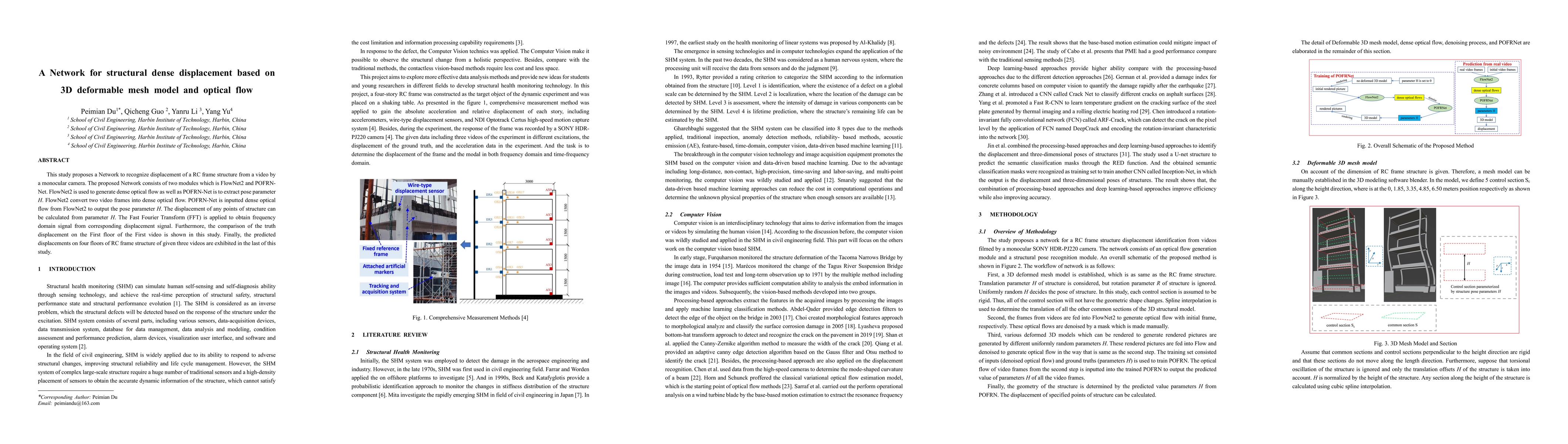 This paper introduces a network combining FlowNet2 and POFRN-Net to detect structural displacement in RC frame structures from monocular video. The network uses optical flow and pose parameter extraction to calculate point displacements, validated through FFT analysis and comparison with true displacement data.