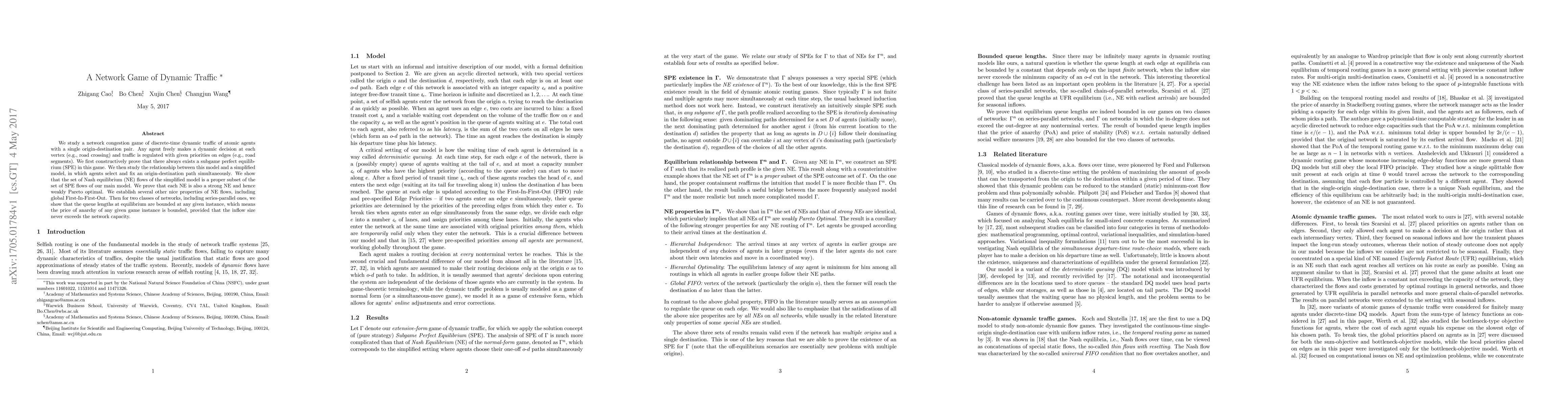 A network game of dynamic traffic shows that a subgame perfect equilibrium always exists and is bounded by a simplified model, with implications for the price of anarchy and queue lengths.
