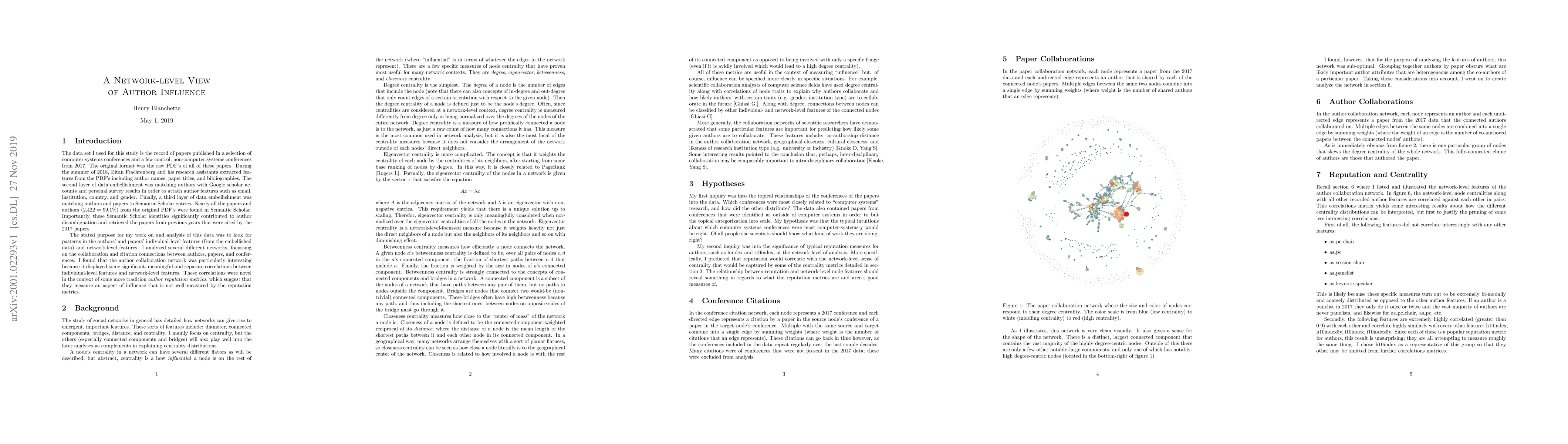 I compare several network-level measures of centrality to common measures of author reputation and influence (e.g. hindex, i10index), all taken over the data set of papers published in 2017 at major computer systems conferences and some controls. I hypothesize that centrality measures will correlate strongly with the reputation and influence measures. My results confirm several expected correlations and exhibit a few surprising absences of correlation. In particular, there was an absence of statistically significant correlation between degree centrality and hindex,