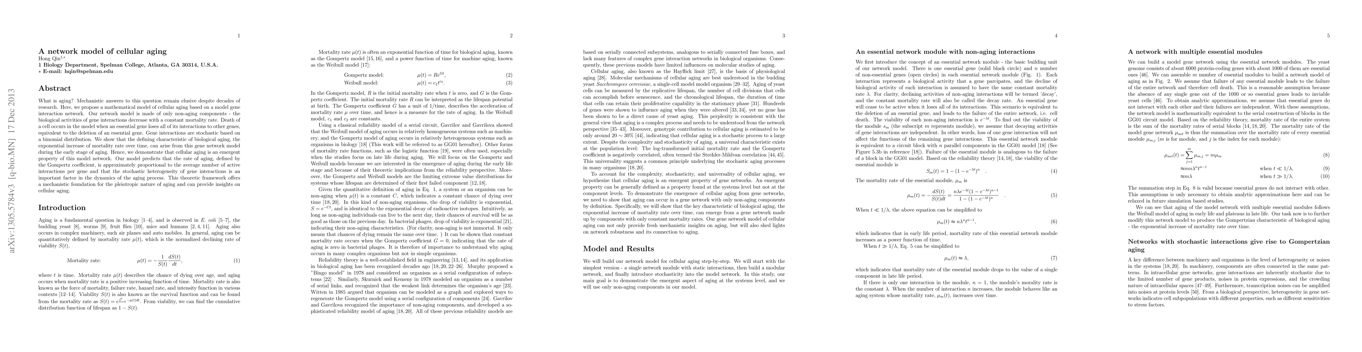 This paper proposes a mathematical model based on a gene interaction network to explain cellular aging. The model shows that aging emerges from the stochastic loss of gene interactions, leading to an exponential increase in mortality rate, suggesting that aging is a network-level phenomenon.