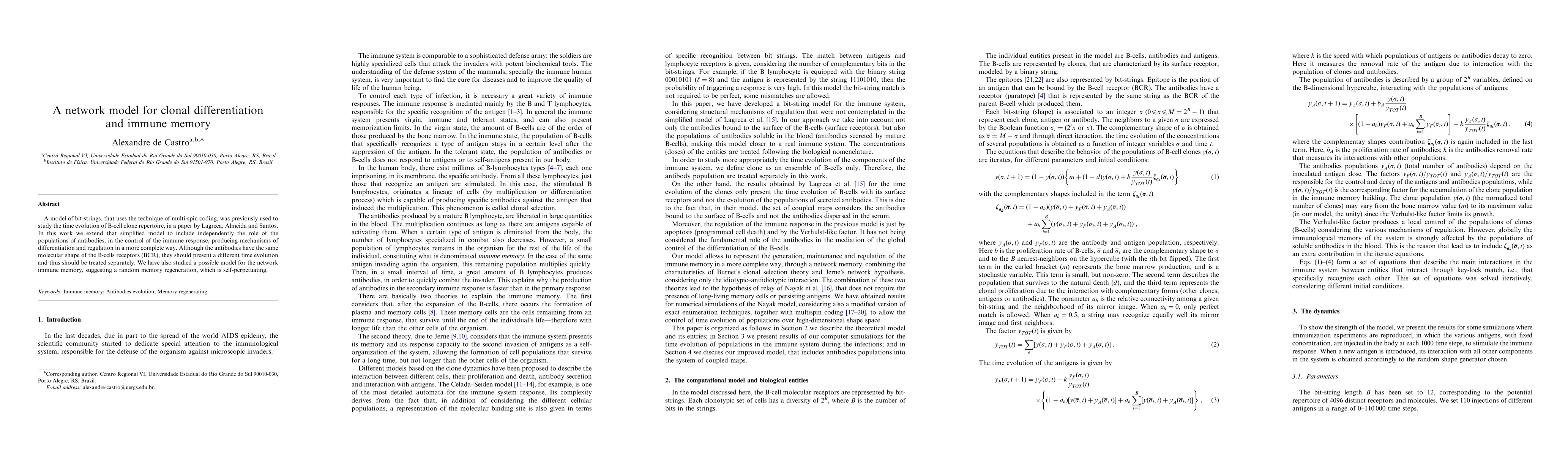 A model of bit-strings, that uses the technique of multi-spin coding, was previously used to study the time evolution of B-cell clone repertoire, in a paper by Lagreca, Almeida and Santos. In this work we extend that simplified model to include independently the role of the populations of antibodies, in the control of the immune response, producing mechanisms of differentiation and regulation in a more complete way. Although the antibodies have the same molecular shape of the B-cells receptors (BCR), they should present a different time evolution and thus should be treated separately. We have also studied a possible model for the network immune memory, suggesting a random memory regeneration, which is self-perpetuating.