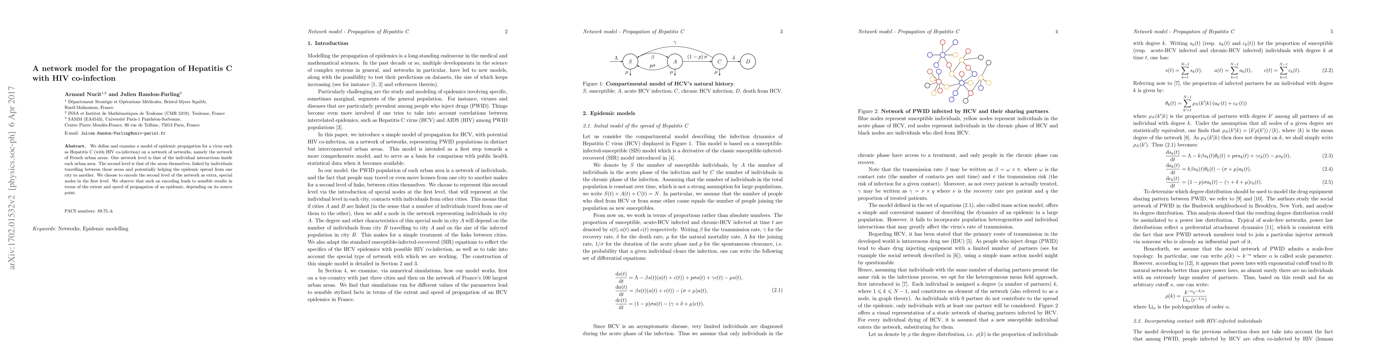 This paper develops a network model to study the spread of Hepatitis C with HIV co-infection across French urban areas, considering both intra-city interactions and inter-city travel. The model's results indicate that the source point significantly influences the epidemic's extent and speed of propagation.