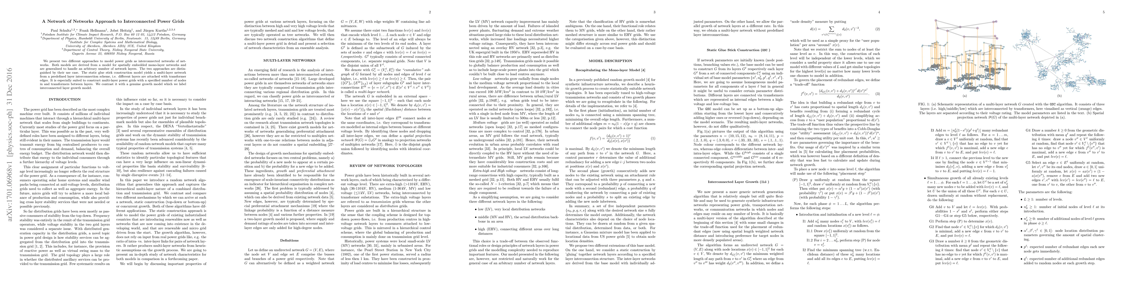 We present two different approaches to model power grids as interconnected networks of networks. Both models are derived from a model for spatially embedded mono-layer networks and are generalised to handle an arbitrary number of network layers. The two approaches are distinguished by their use case. The static glue stick construction model yields a multi-layer network from a predefined layer interconnection scheme, i.e. different layers are attached with transformer edges. It is especially suited to construct multi-layer power grids with a specified number of nodes in and transformers between layers. We contrast it with a genuine growth model which we label interconnected layer growth model.