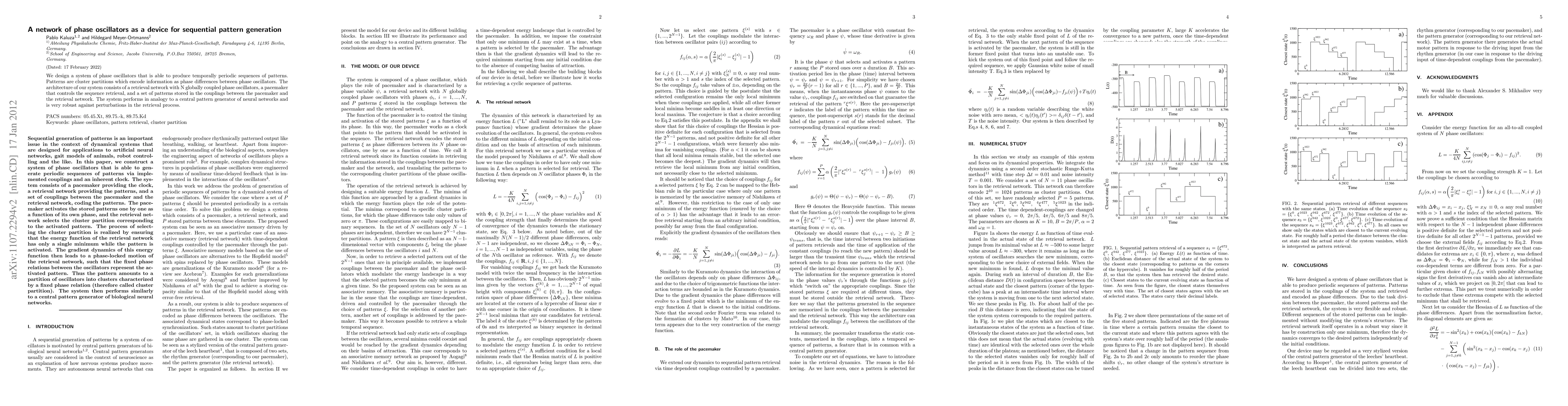 This paper proposes a network of phase oscillators to generate temporally periodic sequences of patterns, where information is encoded in phase differences. The system, robust against perturbations, mimics a central pattern generator and consists of a retrieval network, a pacemaker, and stored patterns in the couplings between them.