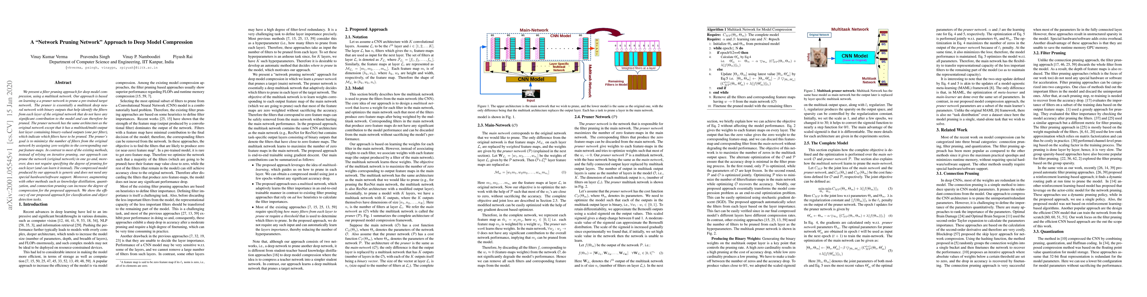 This paper introduces a "Network Pruning Network" for deep model compression, employing a multitask neural network to identify and prune filters in a pre-trained model in one step without iterative processes. The approach achieves significant compression without requiring special hardware, and can be enhanced with additional techniques like knowledge distillation.