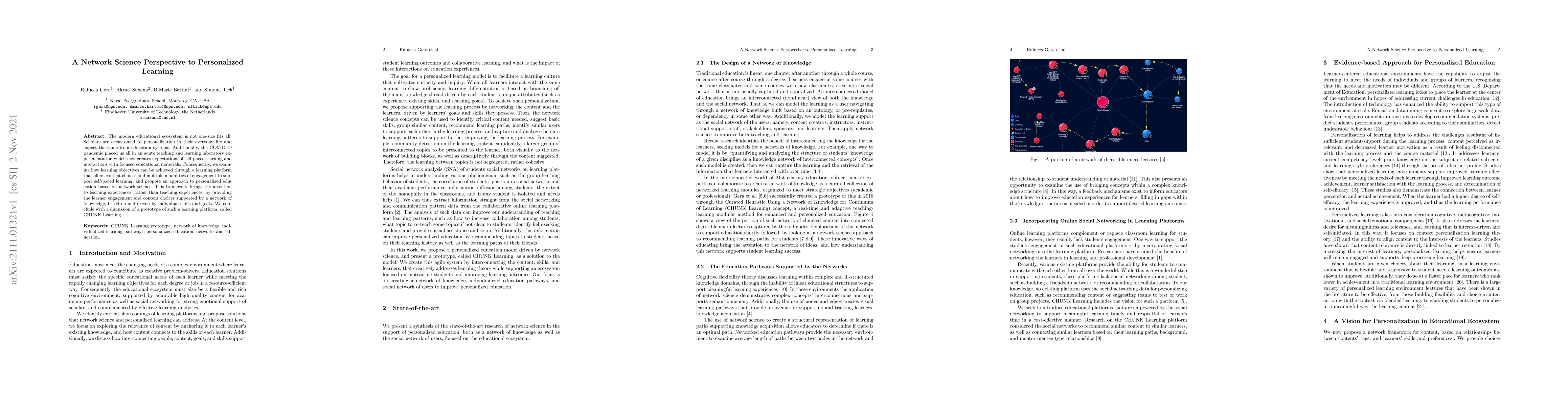 The modern educational ecosystem is not one-size fits all. Scholars are accustomed to personalization in their everyday life and expect the same from education systems. Additionally, the COVID-19 pandemic placed us all in an acute teaching and learning laboratory experimentation which now creates expectations of self-paced learning and interactions with focused educational materials. Consequently, we examine how learning objectives can be achieved through a learning platform that offers content choices and multiple modalities of engagement to support self-paced learning, and propose an approach to personalized education based on network science. This framework brings the attention to learning experiences, rather than teaching experiences, by providing the learner engagement and content choices supported by a network of knowledge, based on and driven by individual skills and goals. We conclude with a discussion of a prototype of such a learning platform, called CHUNK Learning.