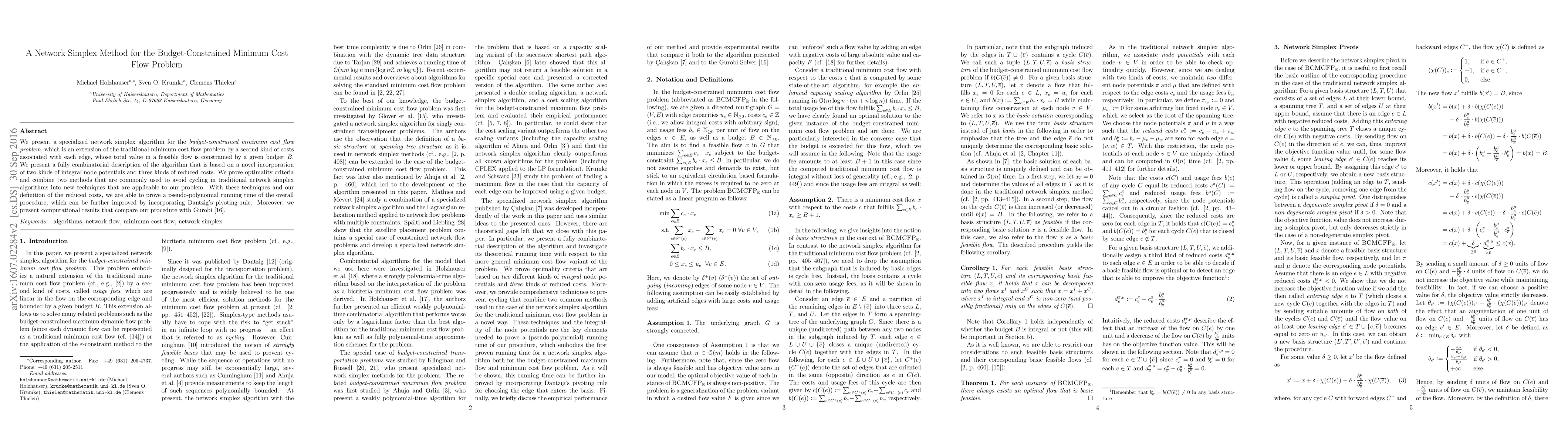 This paper introduces a network simplex algorithm for the budget-constrained minimum cost flow problem, incorporating two integral node potentials and three reduced costs. The algorithm achieves a pseudo-polynomial running time and is compared computationally with Gurobi.