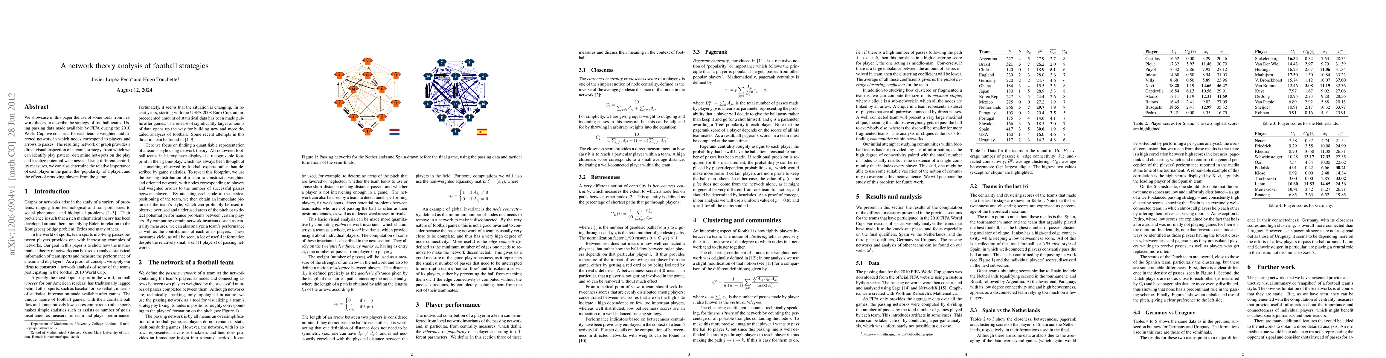 This paper uses network theory to analyze football team strategies during the 2010 World Cup, identifying play patterns, player importance, and potential weaknesses through graph analysis.