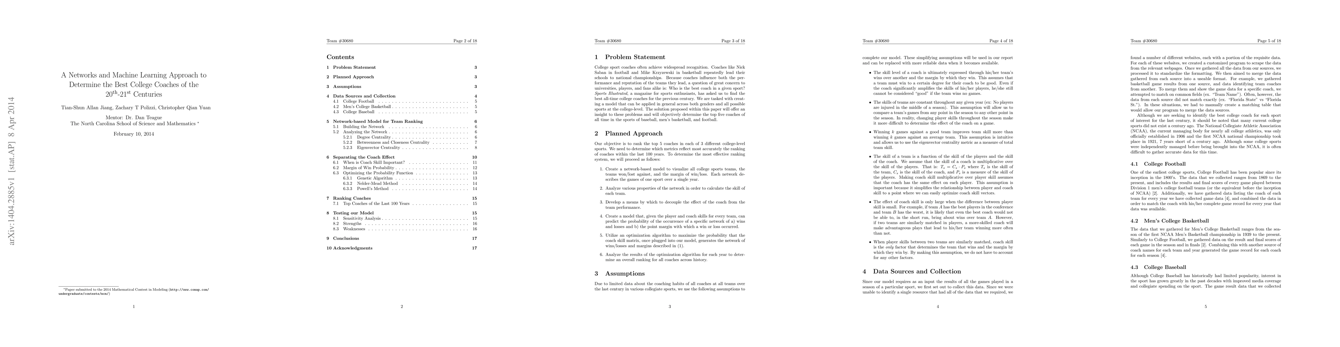 Our objective is to find the five best college sports coaches of past century for three different sports. We decided to look at men's basketball, football, and baseball. We wanted to use an approach that could definitively determine team skill from the games played, and then use a machine-learning algorithm to calculate the correct coach skills for each team in a given year. We created a networks-based model to calculate team skill from historical game data. A digraph was created for each year in each sport. Nodes represented teams, and edges represented a game played between two teams. The arrowhead pointed towards the losing team. We calculated the team skill of each graph using a right-hand eigenvector centrality measure. This way, teams that beat good teams will be ranked higher than teams that beat mediocre teams. The eigenvector centrality rankings for most years were well correlated with tournament performance and poll-based rankings. We assumed that the relationship between coach skill $C_s$, player skill $P_s$, and team skill $T_s$ was $C_s \cdot P_s = T_s$. We then created a function to describe the probability that a given score difference would occur based on player skill and coach skill. We multiplied the probabilities of all edges in the network together to find the probability that the correct network would occur with any given player skill and coach skill matrix. We was able to determine player skill as a function of team skill and coach skill, eliminating the need to optimize two unknown matrices. The top five coaches in each year were noted, and the top coach of all time was calculated by dividing the number of times that coach ranked in the yearly top five by the years said coach had been active.