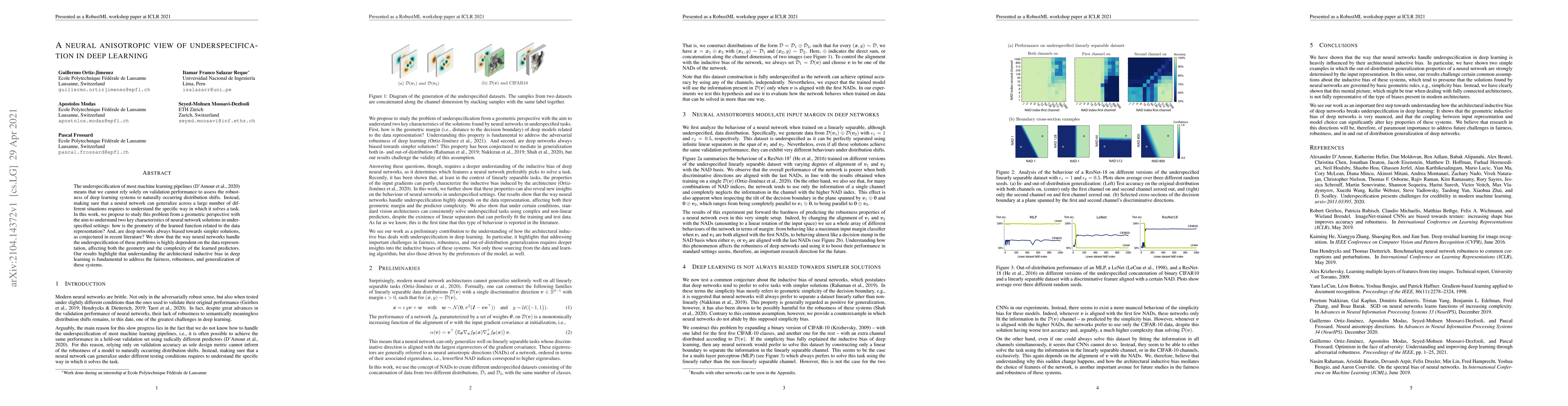 The underspecification of most machine learning pipelines means that we cannot rely solely on validation performance to assess the robustness of deep learning systems to naturally occurring distribution shifts. Instead, making sure that a neural network can generalize across a large number of different situations requires to understand the specific way in which it solves a task. In this work, we propose to study this problem from a geometric perspective with the aim to understand two key characteristics of neural network solutions in underspecified settings: how is the geometry of the learned function related to the data representation? And, are deep networks always biased towards simpler solutions, as conjectured in recent literature? We show that the way neural networks handle the underspecification of these problems is highly dependent on the data representation, affecting both the geometry and the complexity of the learned predictors. Our results highlight that understanding the architectural inductive bias in deep learning is fundamental to address the fairness, robustness, and generalization of these systems.