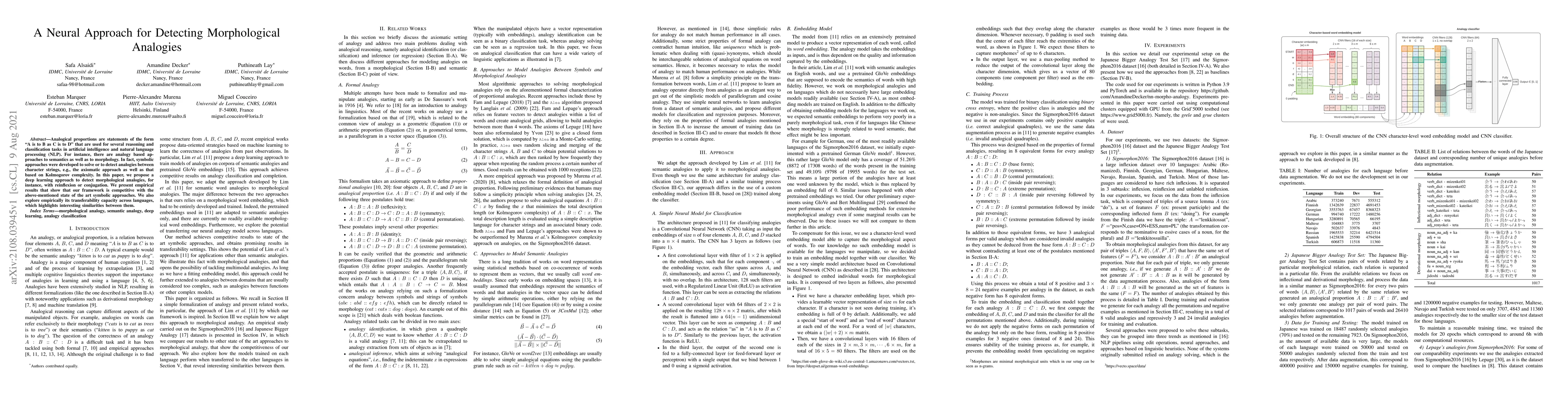 This paper proposes a deep learning approach to detecting morphological analogies, outperforming symbolic approaches in several reasoning tasks. It also shows that the method can be transferred across languages, highlighting similarities between them.
