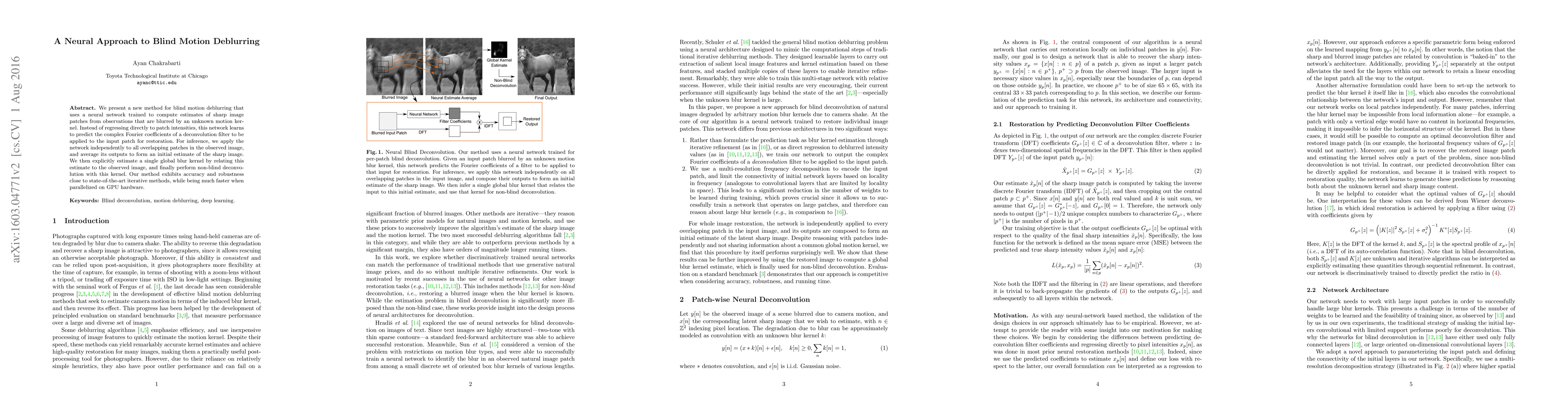 A discriminatively trained neural network was introduced for blind image deconvolution, providing a robust and efficient approach to image restoration.