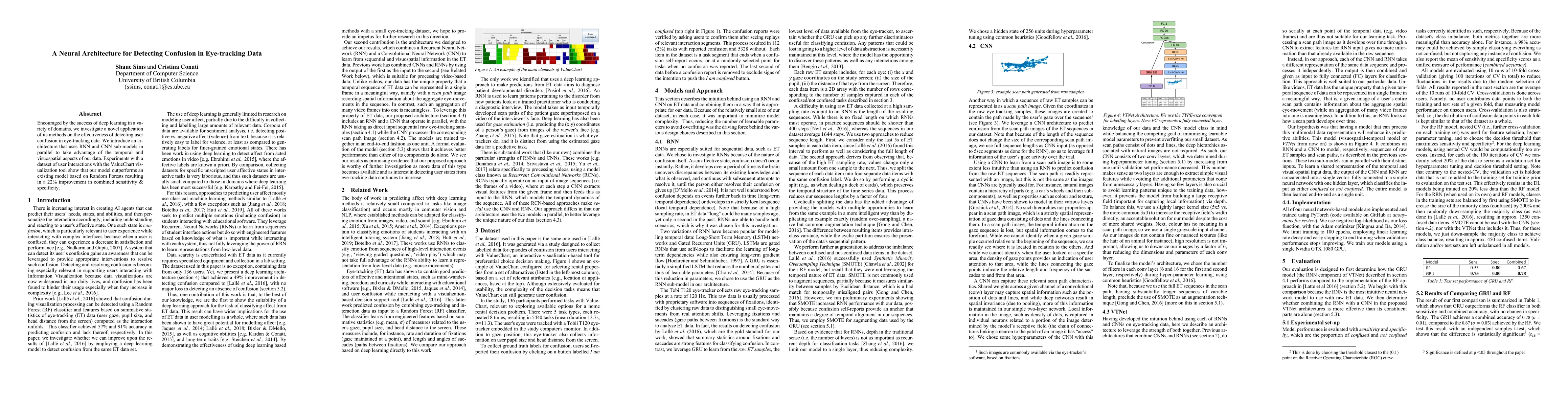 This paper proposes a neural architecture combining RNN and CNN models to detect user confusion from eye-tracking data, achieving a 22% improvement over a Random Forest-based model in sensitivity and specificity when tested on interactions with the ValueChart visualization tool.