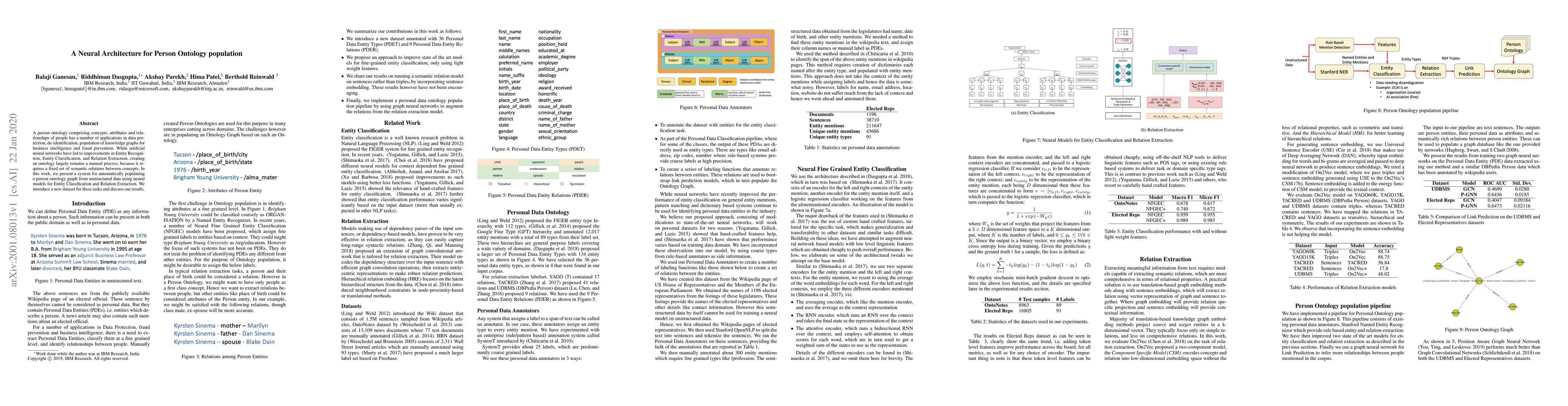 The paper presents a neural architecture for automatically populating a person ontology graph from unstructured data using neural models for Entity Classification and Relation Extraction. It introduces a new dataset annotated with 36 Personal Data Entity Types (PDET) and 9 Personal Data Entity Relations (PDER).