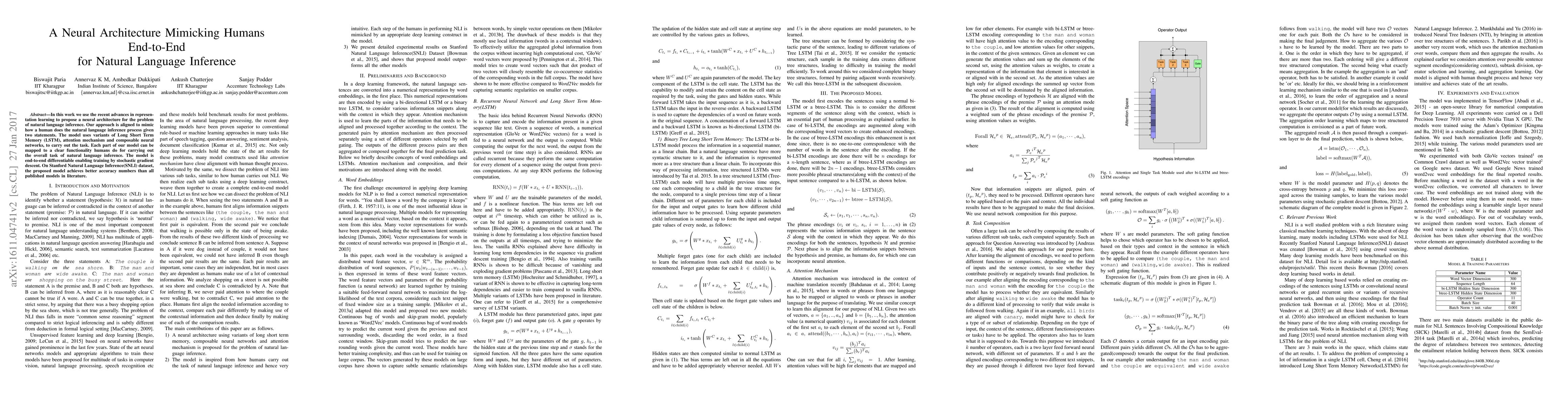 This paper introduces a neural architecture inspired by human cognitive processes for natural language inference, leveraging LSTM, attention mechanisms, and composable neural networks. The end-to-end differentiable model outperforms existing models on the SNLI dataset.