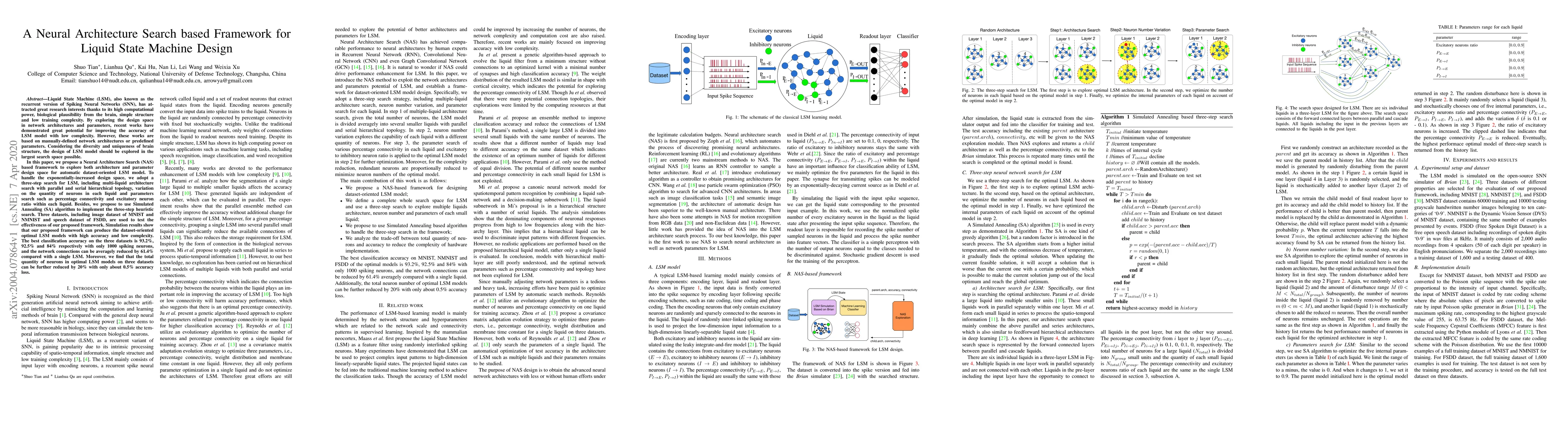 This paper proposes a Neural Architecture Search (NAS) framework to automatically explore the design space of Liquid State Machines (LSM) for optimal model performance. Using a three-step search with Simulated Annealing, the framework optimizes both architecture and parameters, achieving high accuracy (up to 93.2%) and low complexity (61.4% reduction in network connections) on MNIST, NMNIST, and FSDD datasets.