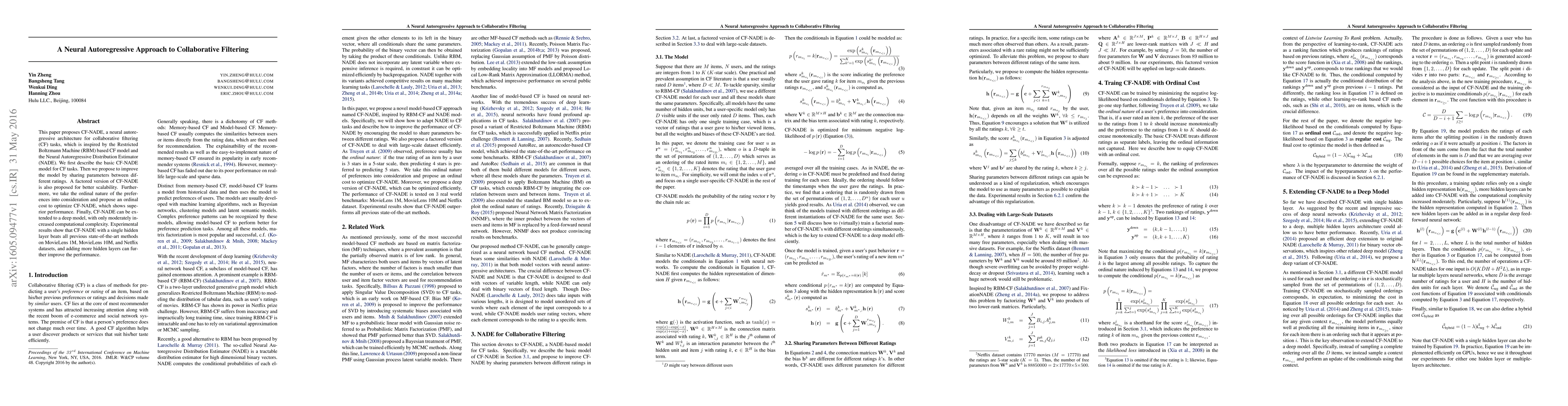 This paper introduces CF-NADE, a neural autoregressive model for collaborative filtering that outperforms previous methods on several datasets. It incorporates parameter sharing, ordinal cost optimization, and scalability improvements, and demonstrates superior performance with deep extensions.
